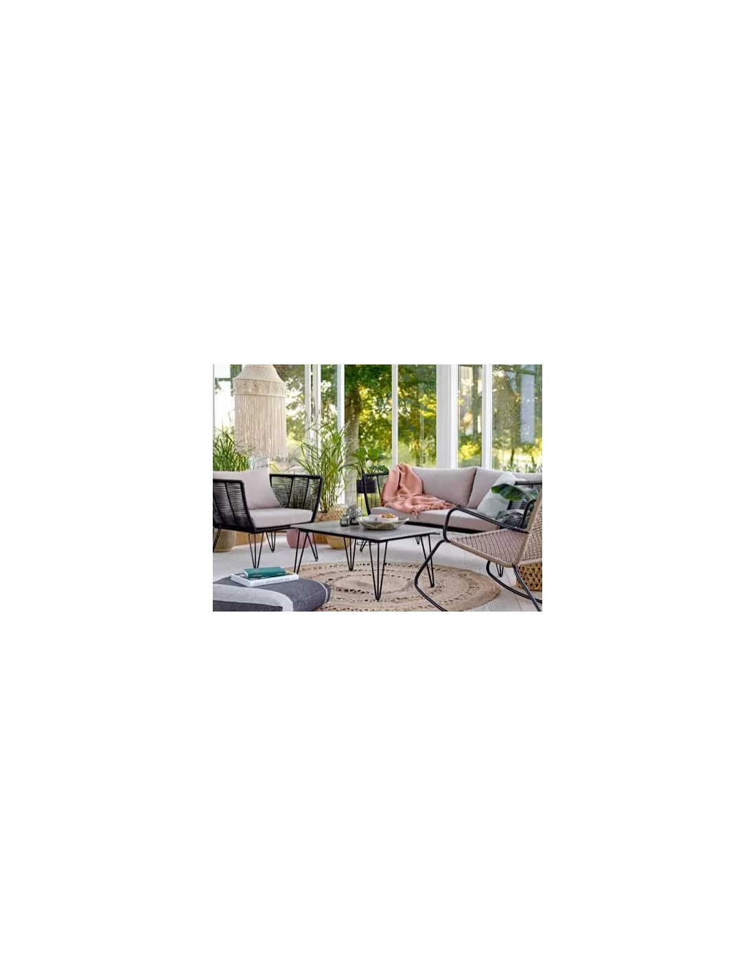 Inspiré du ‘’mobilier scoubidou’’ des années 50, ce canapé extérieur Mundo Bloomingville se compose de fils en PVC, tressés sur une fine armature en métal laqué. Ce cordage en plastique est résistant aux intempéries et aux rayons UV. La matière ajourée apporte une grande légèreté visuelle. Les coussins confortables sont recouverts de tissu polyester imperméable, adapté à une utilisation à l’extérieur. Très fifties, le piètement anguleux en fil d’acier est aérien et graphique. Détendez-vous dans ce très beau canapé danois de la Maison Bloomingville. Ses coussins gris déperlant sont dotés d’une housse en polyester lavable en machine à 30°.
