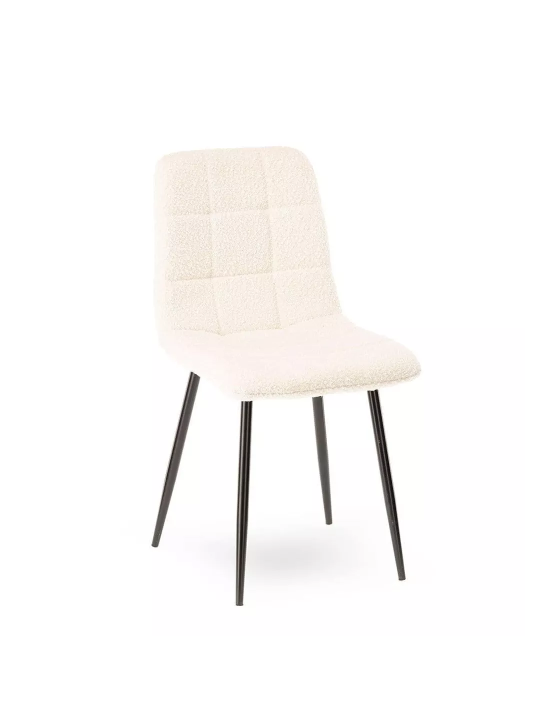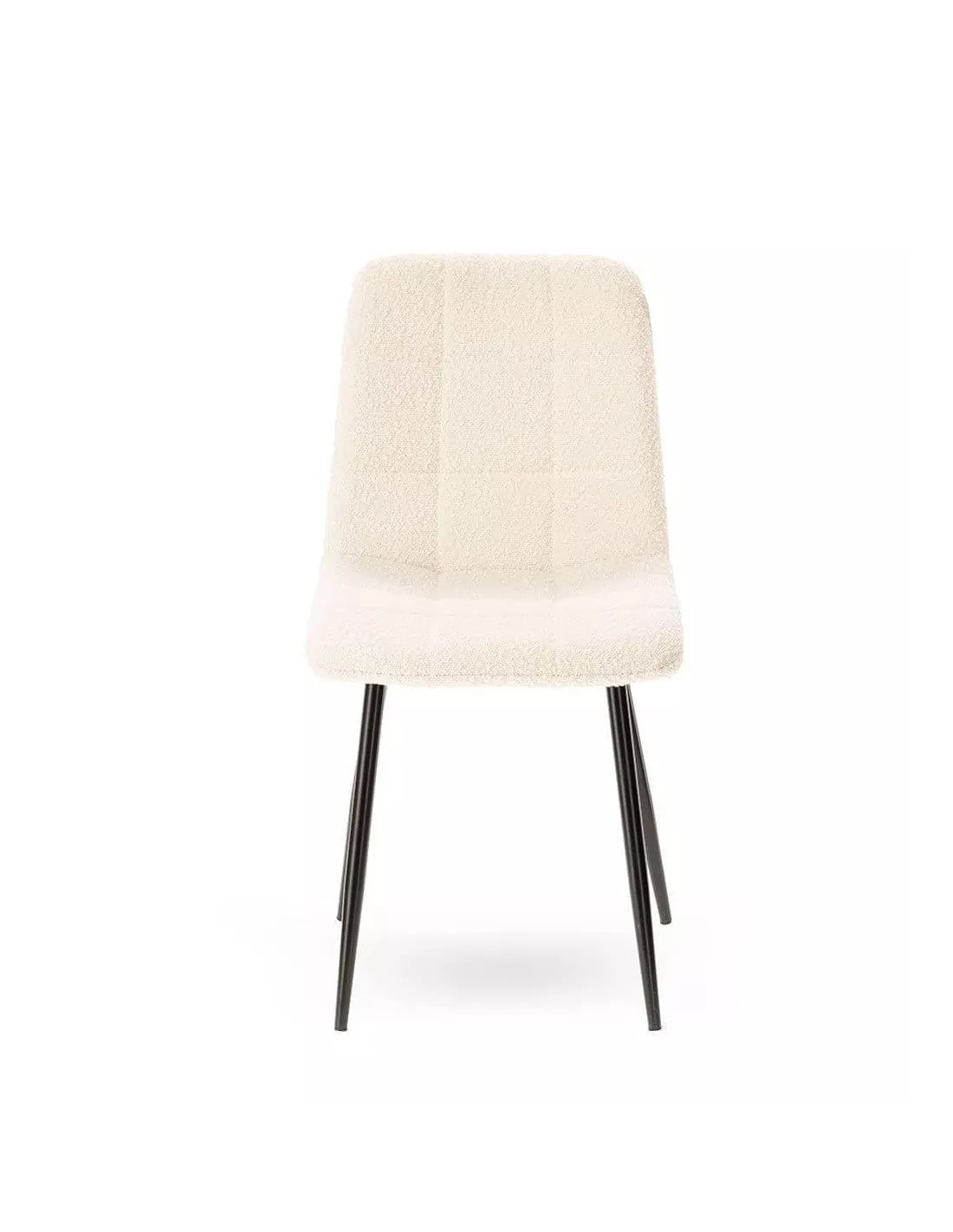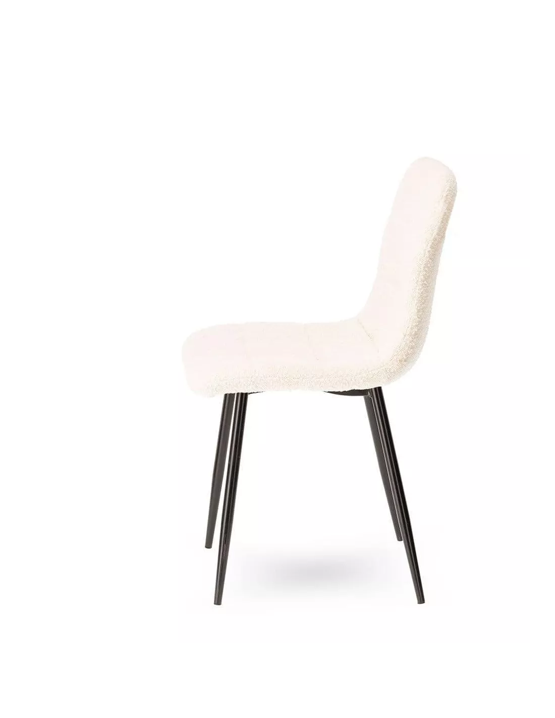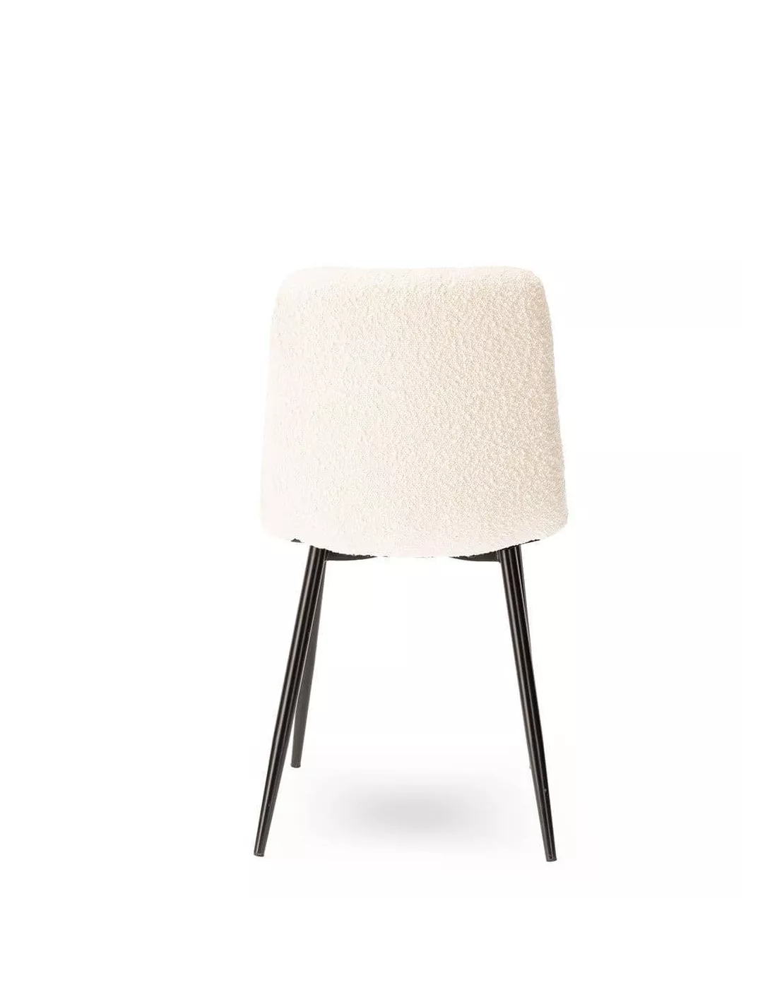 Avec ses lignes simples et douces inspirées du style scandinave, cette chaise design en bouclette blanche s’harmonisera facilement avec votre table de salle à manger et à votre décoration. Cette chaise est dotée d’une assise moelleuse et douillette et de pieds fuselés en métal noir. Son design se révèle être extrêmement confortable.