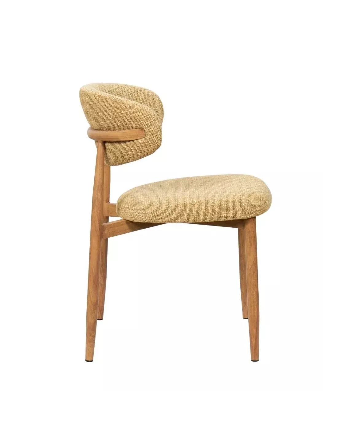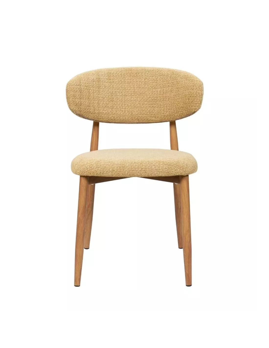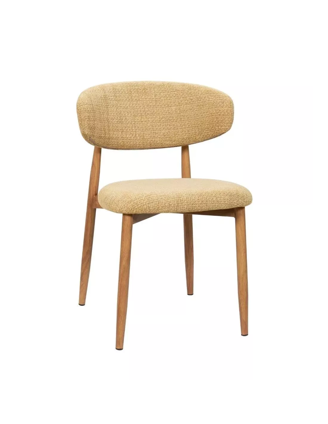 La chaise Georgia Moutarde Pied Naturel allie subtilement le charme du bois et la texture chiné du tissu. Derrière cette apparence vintage se cache une structure en métal, soigneusement peinte pour rappeler le look naturel et apporter une touche seventies.