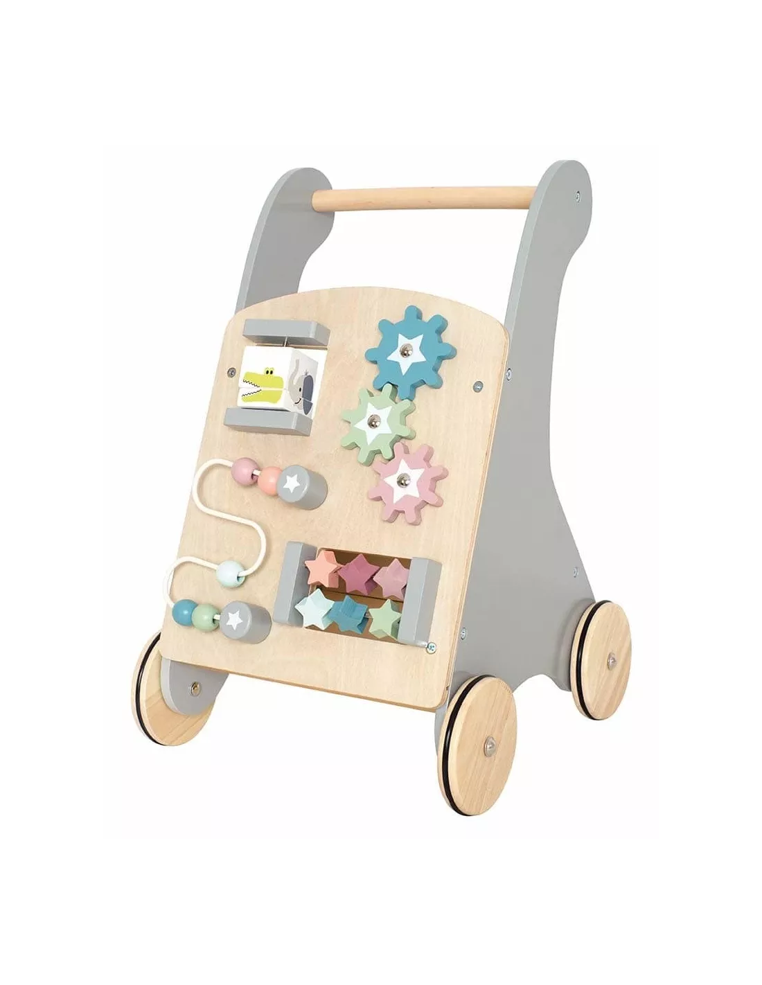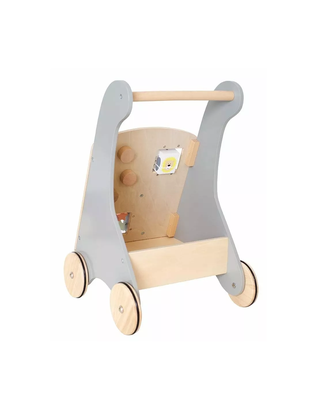 Chariot e marche et d’activités en bois avec bac de rangement au dos, JaBaDaBaDo