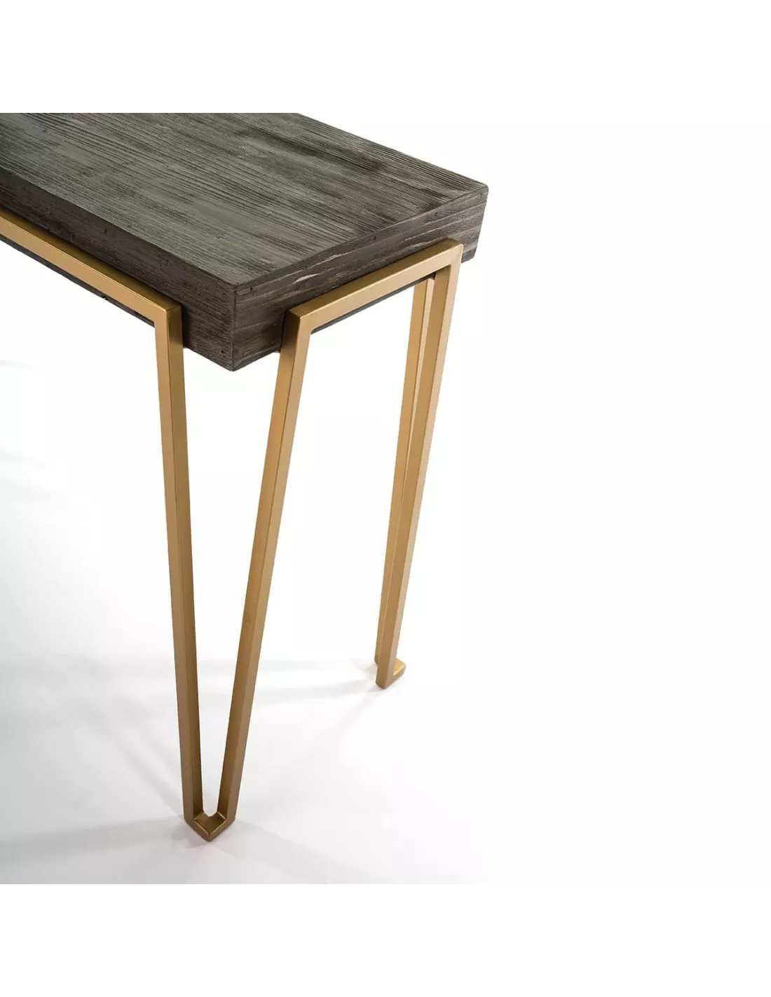 Console Emma Thai Natura réalisée en bois d’épicéa recyclé, dotée d’un piètement en métal doré mat, très tendance pour votre décoration intérieure. La console Emma apportera une touche intemporelle et raffinée à votre décoration intérieure.