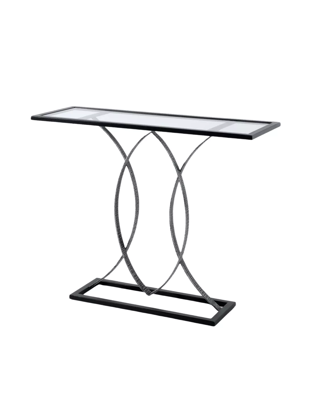 Console design en métal gris anthracite et plateau en verre, idéale dans un salon, une entrée ou une chambre.