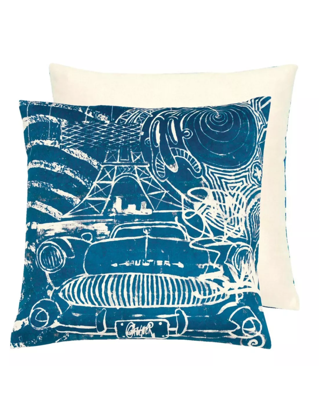 Confession bleu est un coussin Jean Paul Gaultier au toucher suédine incomparable. Il reprend un détail du motif du tissu Street. On y distingue, entre autres expérimentations graphiques, la tour Eiffel, de la résille, une voiture et la rayure Gaultier. Dos uni.