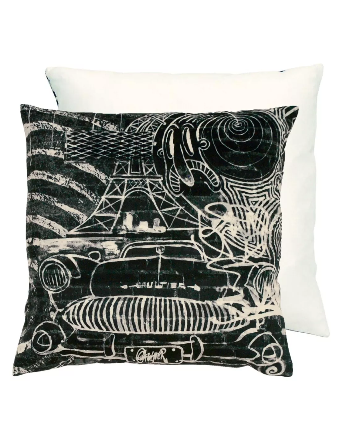 Coussin carré noir et écru arborant des motifs symbolisant la France, Jean Paul Gaultier
