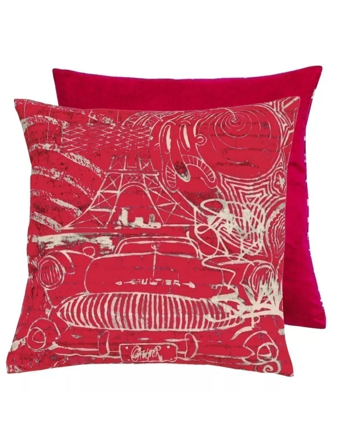 Confession rouge est un coussin Jean Paul Gaultier au toucher suédine incomparable. Il reprend un détail du motif du tissu Street. On y distingue, entre autres expérimentations graphiques, la tour Eiffel, de la résille, une voiture et la rayure Gaultier. Dos uni.