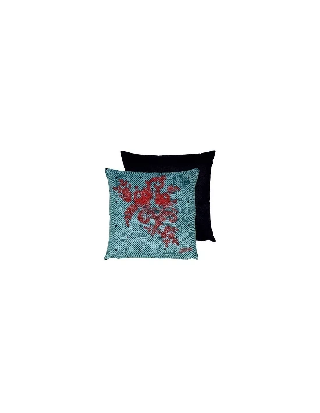 Coussin carré Discret bleu/rouge Jean Paul Gaultier Maison, dont le dos est uni noir. Ce coussin est issu de la collection Dentelle, coordonné aux coussins Féminine, signature Jean Paul Gaultier.