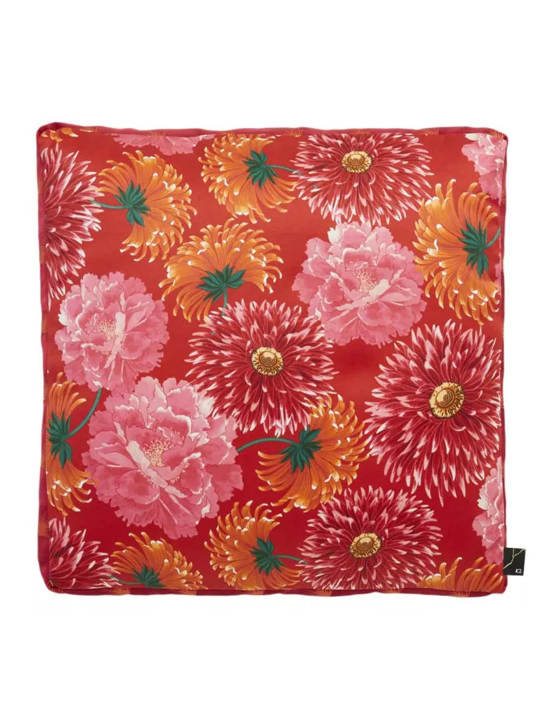 Coussin carré au parterre de fleurs de couleurs vives et au verso rouge, K3 design by Kenzo Takada