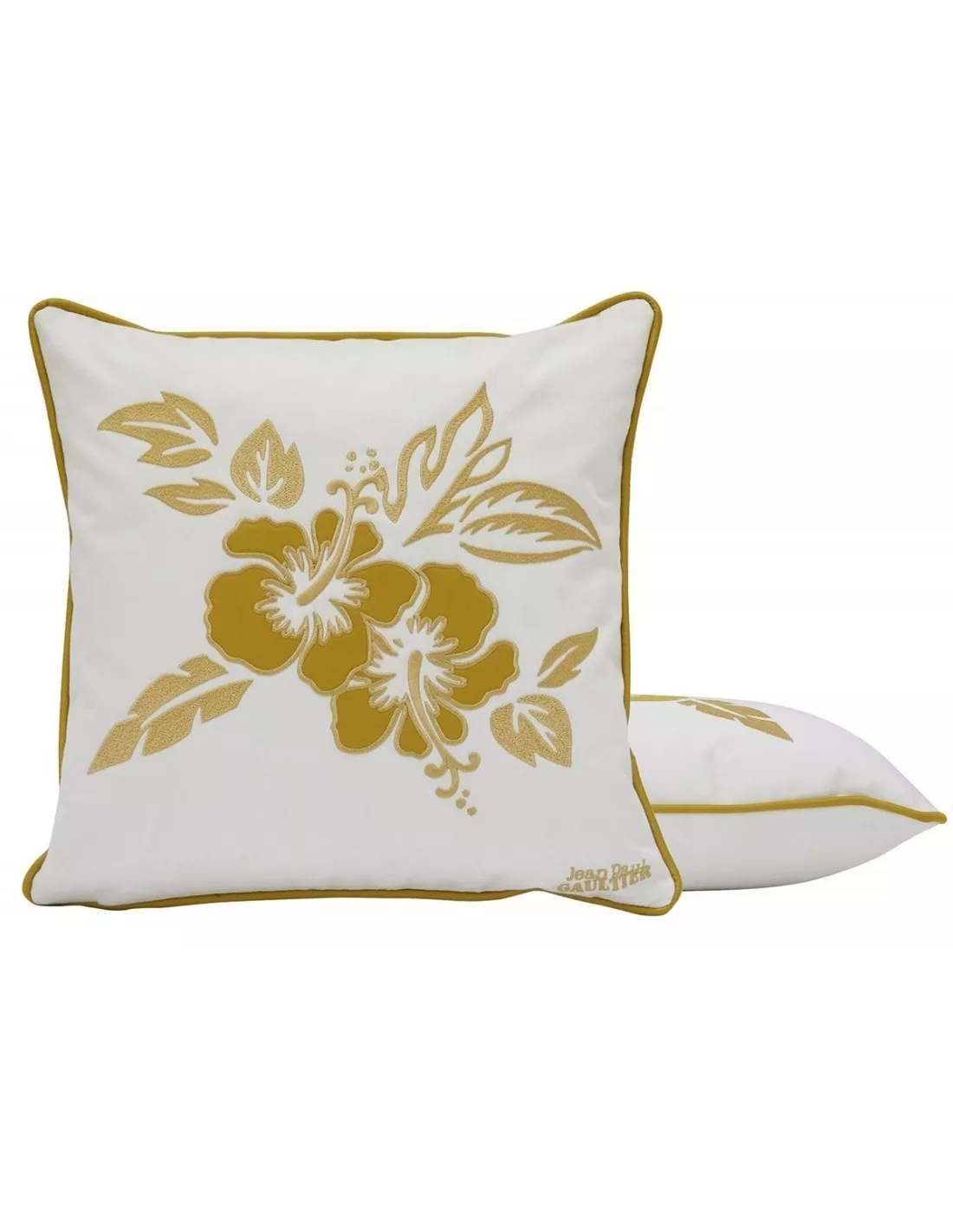 Coussin carré blanc et jaune présentant un détail du papier peint Jamaïque, Jean Paul Gaultier