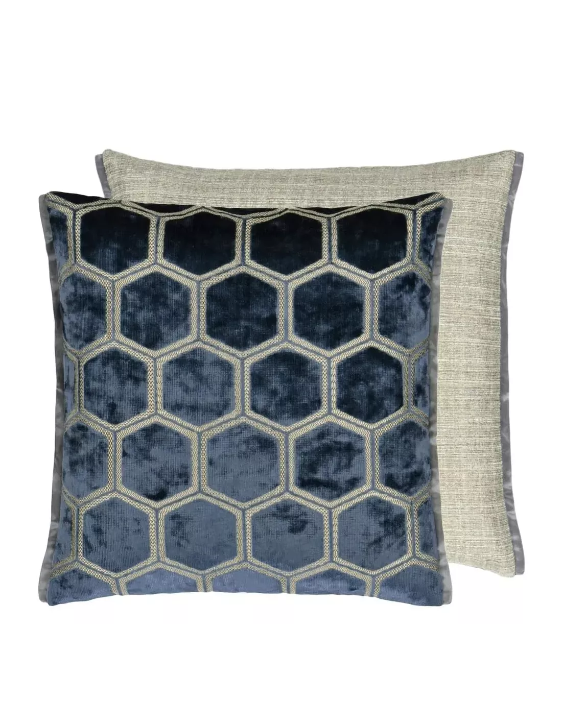 Cet élégant coussin carré Manipur Midnight en velours coupé de couleur bleu nuit arbore une géométrie hexagonale. Le côté recto est taillé dans un velours coupé composé d’un mélange de matières. Le côté verso est décoré de stries qui révèlent le grain du polyester teinté d’une couleur sobre. Ce luxueux coussin Designers Guild est complété par une bordure zinc.