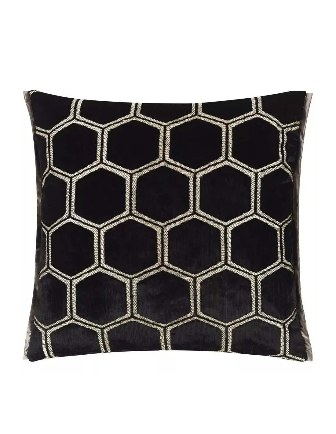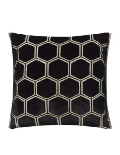 Cet élégant coussin carré Manipur Noir en velours coupé de couleur noir arbore une géométrie hexagonale. Le côté recto est taillé dans un velours coupé composé d’un mélange de matières. Le côté verso est décoré de stries qui révèlent le grain du polyester teinté d’une couleur sobre. Ce luxueux coussin Designers Guild est complété par une bordure zinc.