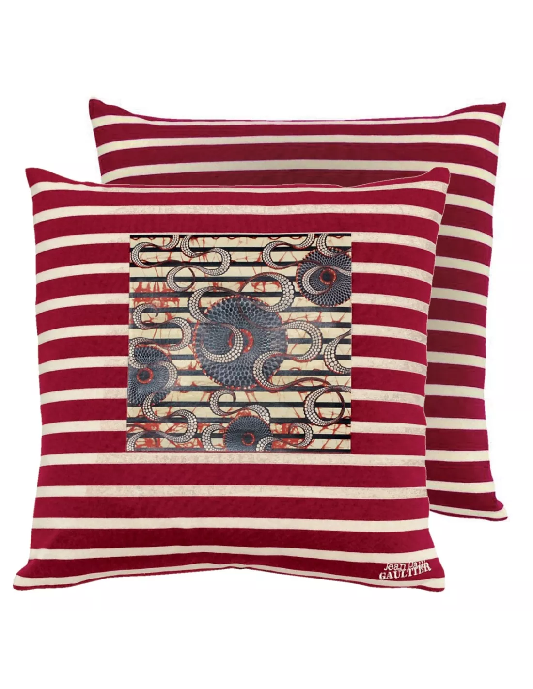 Coussin Origine rouge Jean Paul Gaultier siglé en bas à droite. La célèbre rayure marine en jersey de coton de Jean Paul Gaultier met en valeur un « transfert » du tissu Melting Pot.