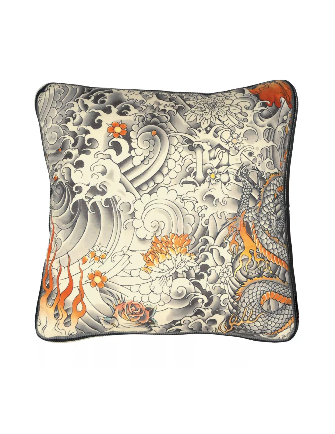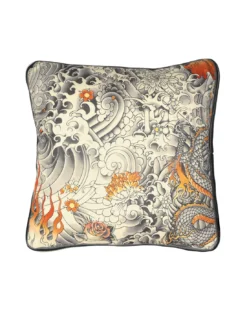 Coussin Tender gold by Jean Paul Gaultier dont le dos est uni. Le coussin design Tender au motif de tatouage reprend le dessin du tissu Jean Paul Gaultier Komodo.