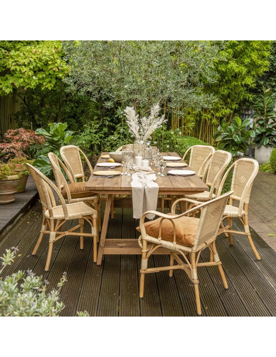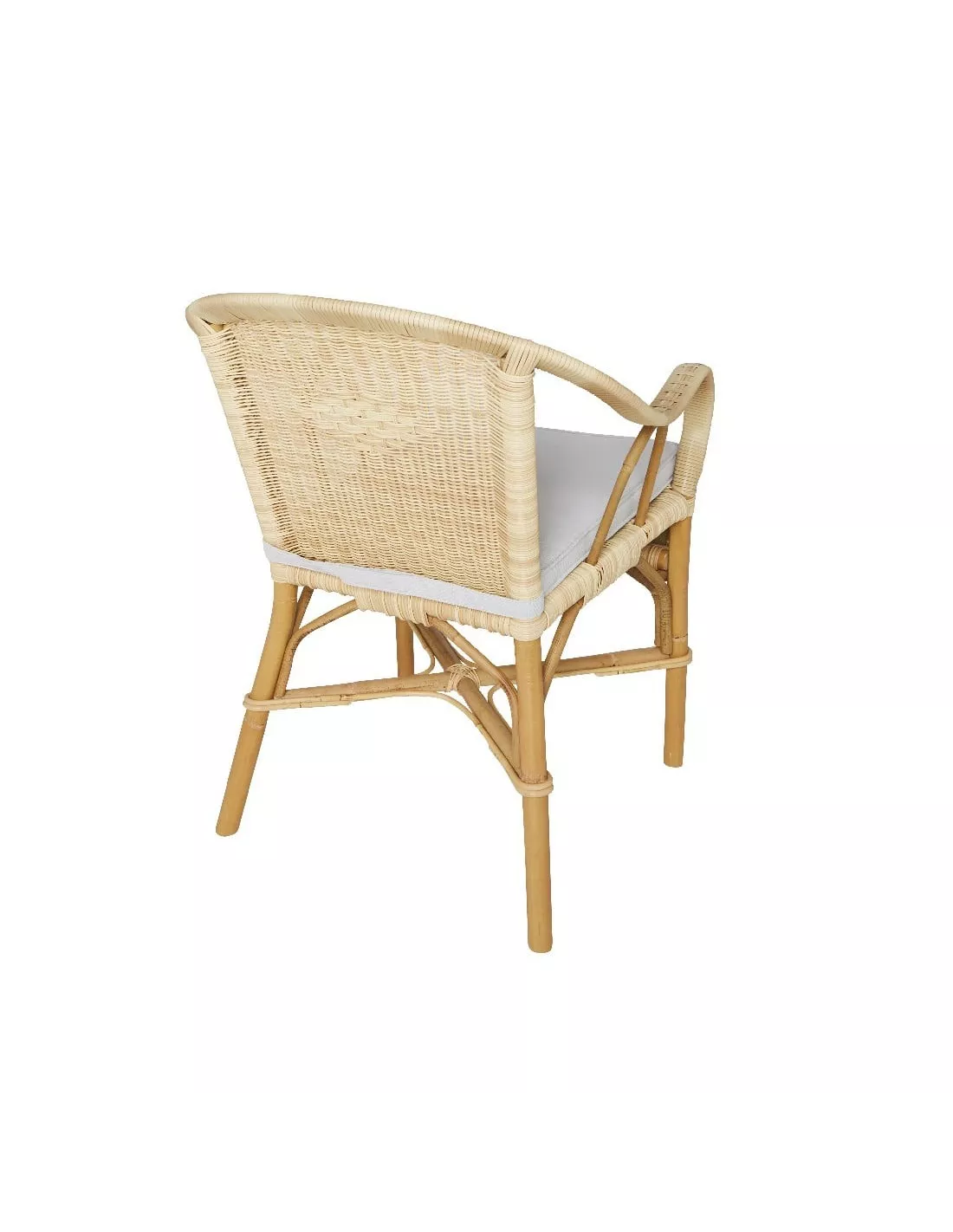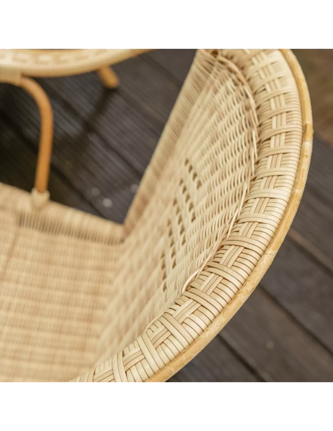 Le fauteuil grand-père en rotin + résine, ici dans sa version bas dossier et avec un tressage en résine, est LE modèle emblématique du rotin à la française. Très populaire dans nos campagnes au début des années 1900, il était vendu (dans sa version tout rotin) à l’époque par les colporteurs qui allaient de village en village. Confortable, simple et robuste, il reste très actuel. On s’en servira de fauteuil d’appoint, mais sa hauteur d’assise permet de l’utiliser aussi autour d’une table de repas. Il est décliné ici avec un tressage en résine de synthèse imitant la fibre naturelle, pour une utilisation plus « outdoor’ et une meilleure résistance aux usages intensifs.