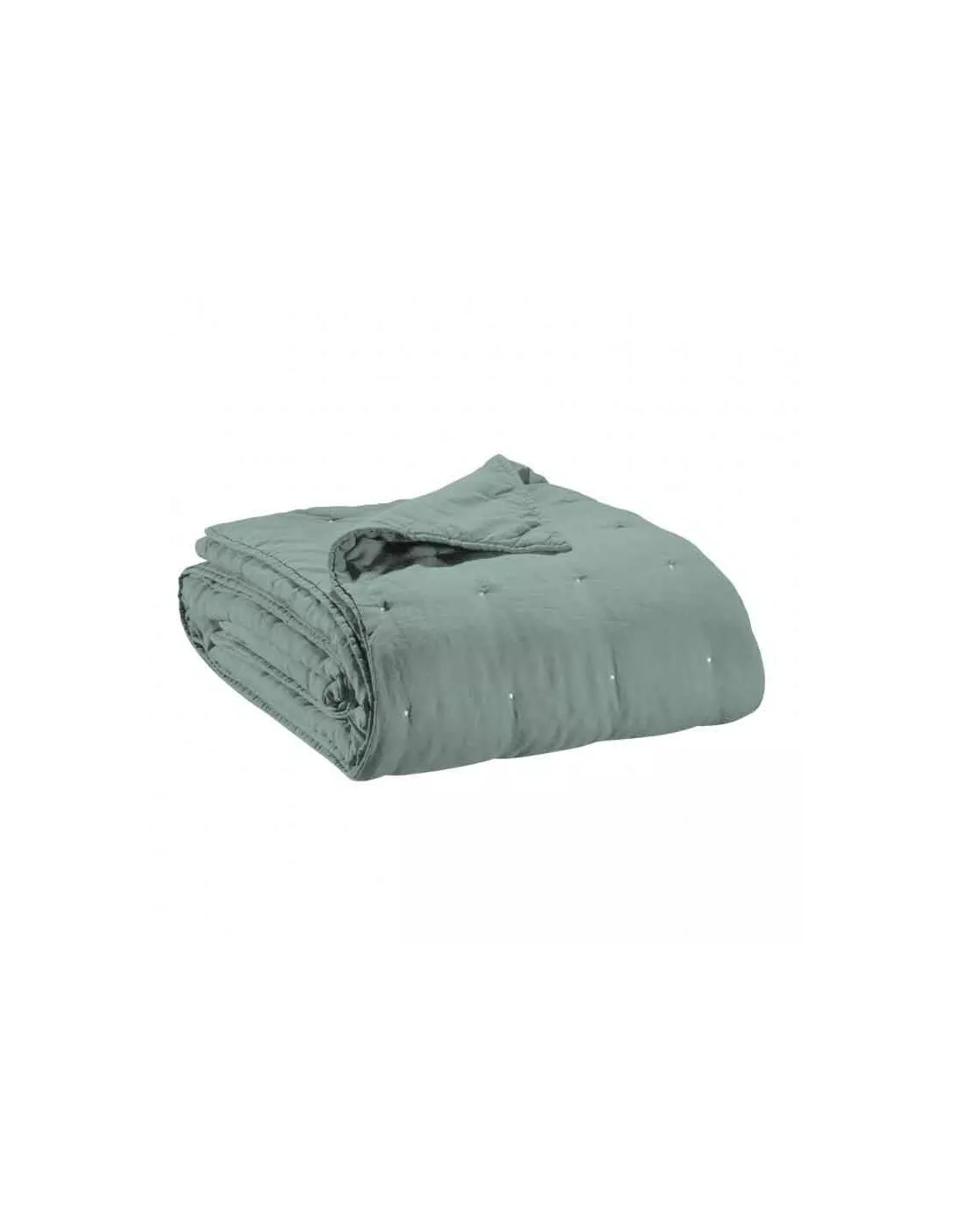 Jeté de lit en lin vert de gris finition points de broderie, Vivaraise
