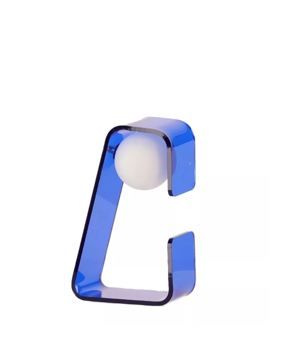 Plongez votre intérieur dans une ambiance Pop et rétrofuturiste avec cette lampe design Charlotte Bleue. Son esprit se décline dans une forme épurée en acrylique bleu, enveloppant élégamment une boule en verre opaque blanc.