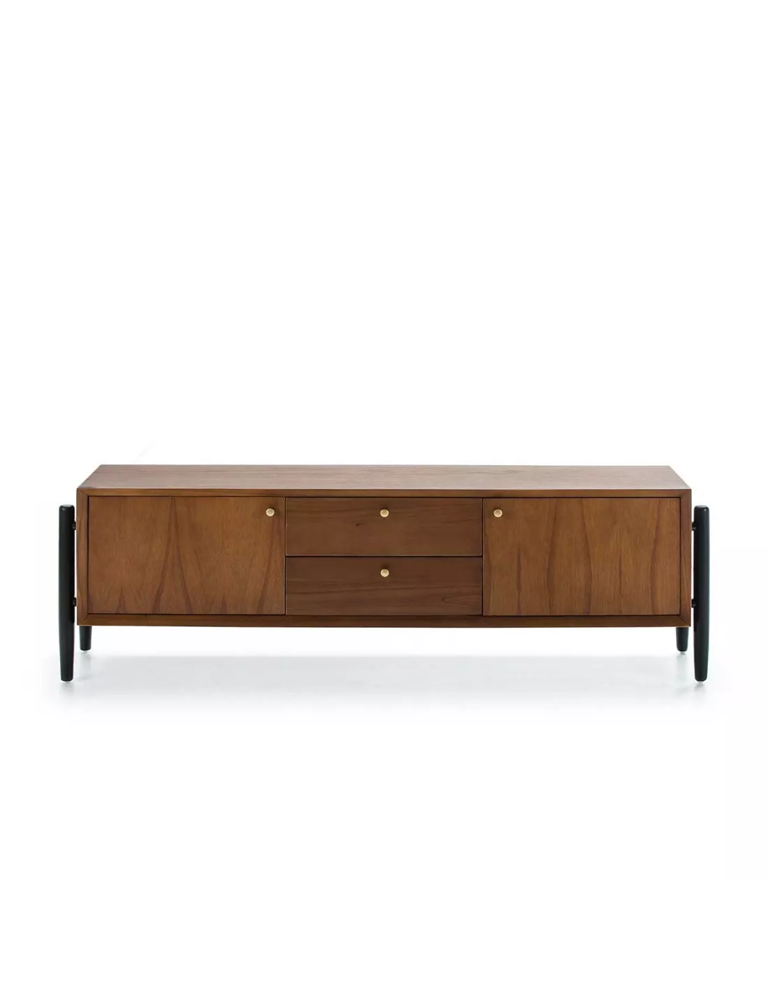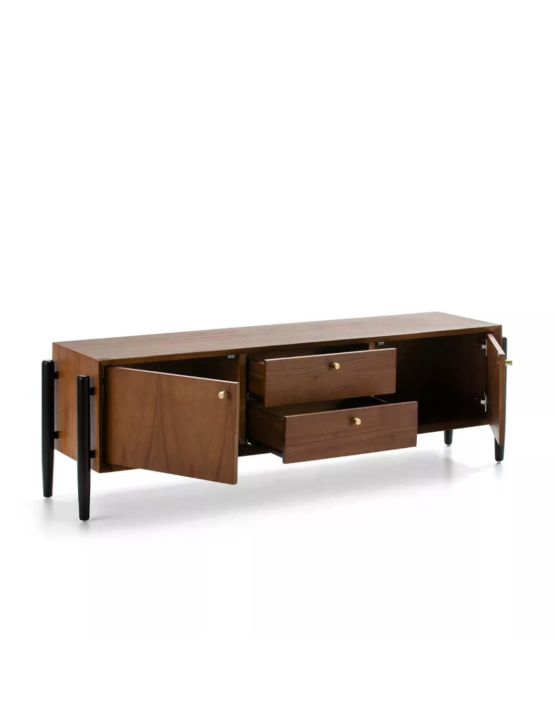 Meuble TV en bois noir et brun 2 portes 2 tiroirs et poignées dorées 160cm, Thai Natura