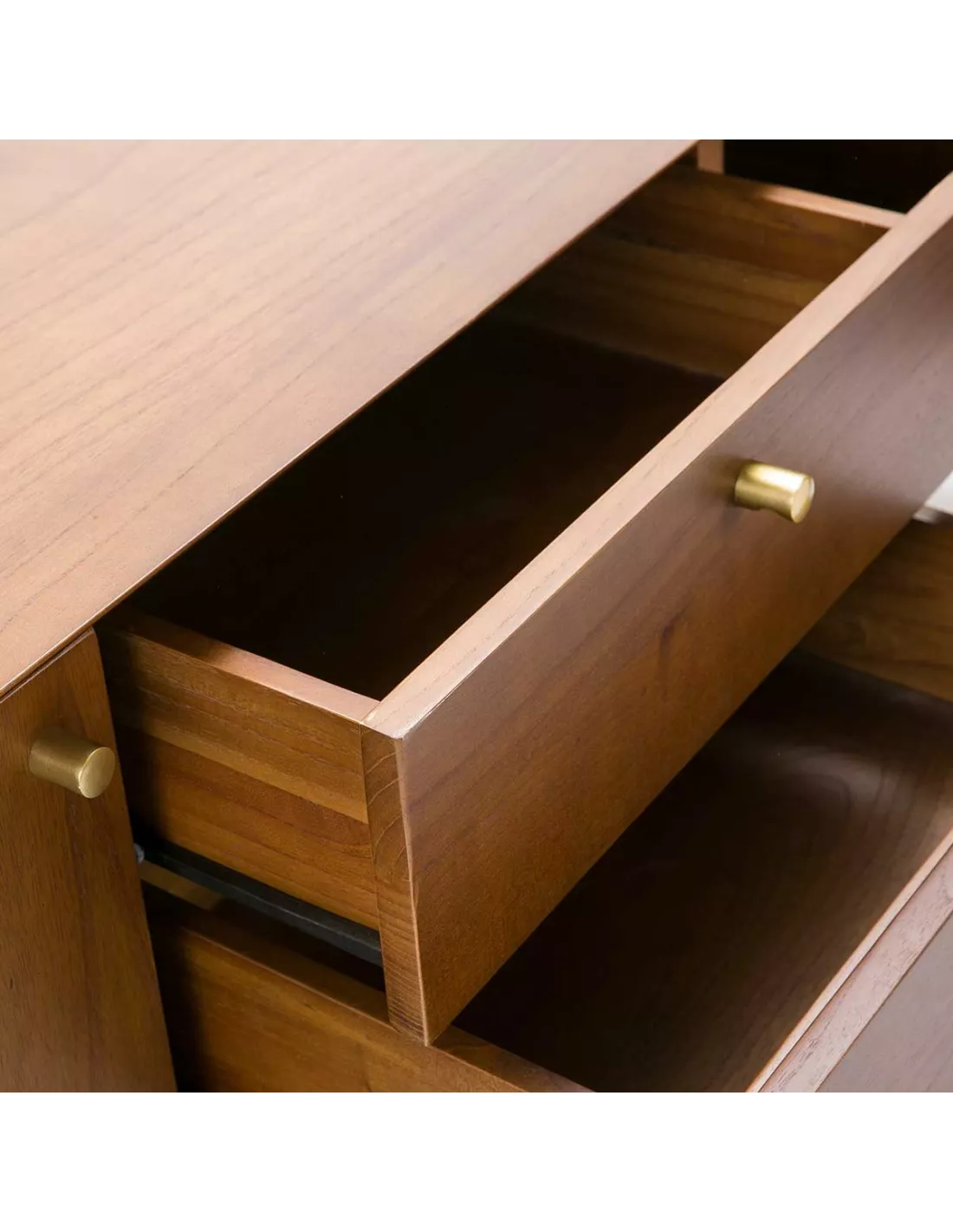 Laissez vous séduire par ce meuble TV Thai Natura en bois naturel issu de forêts durables. Ce meuble TV, doté de 2 portes et de 2 tiroirs, se mariera avec tous les styles d’intérieur et donnera une touche raffinée à votre décoration. Ce meuble TV aux poignées en métal doré est fabriqué en Espagne.