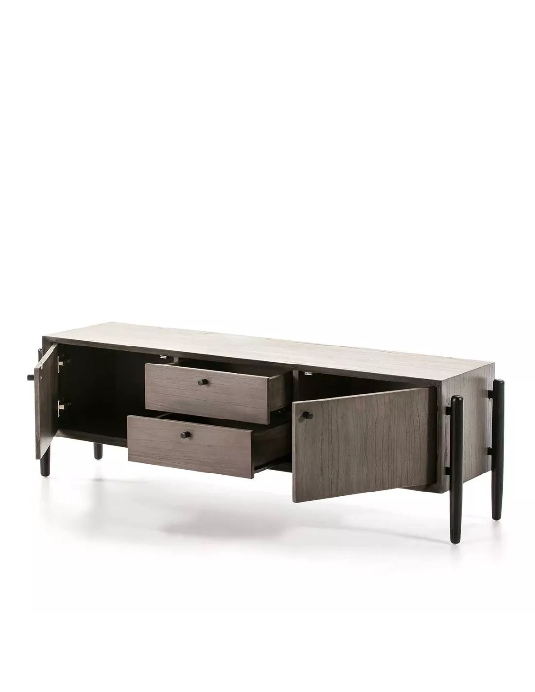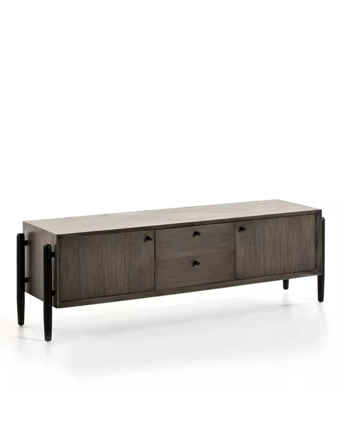 Laissez vous séduire par ce meuble TV Thai Natura en bois gris et noir issus de forêts durables. Ce meuble TV, doté de 2 portes et de 2 tiroirs, se mariera avec tous les styles d’intérieur et donnera une touche raffinée à votre décoration. Ce meuble TV aux poignées en métal noir est fabriqué en Espagne.