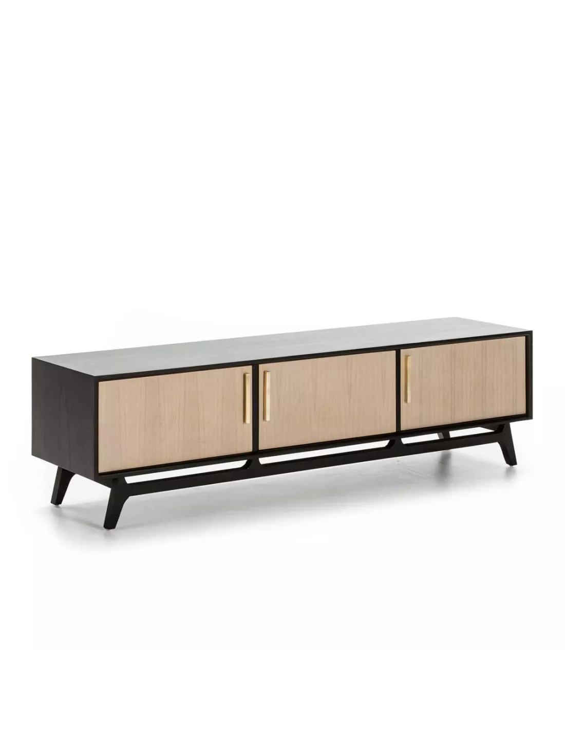 Meuble TV en bois naturel légèrement grisé et noir 3 portes 160cm, Thai Natura