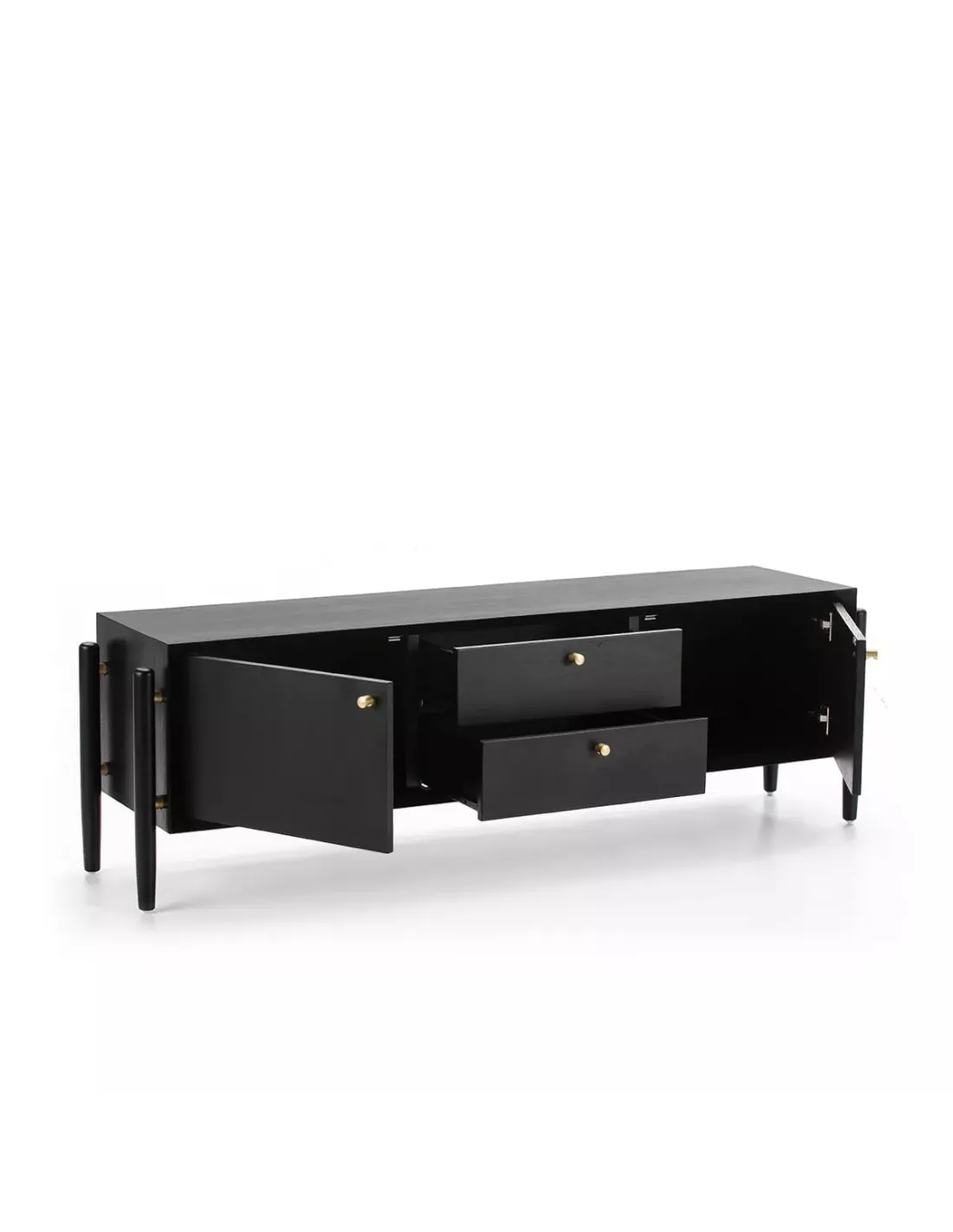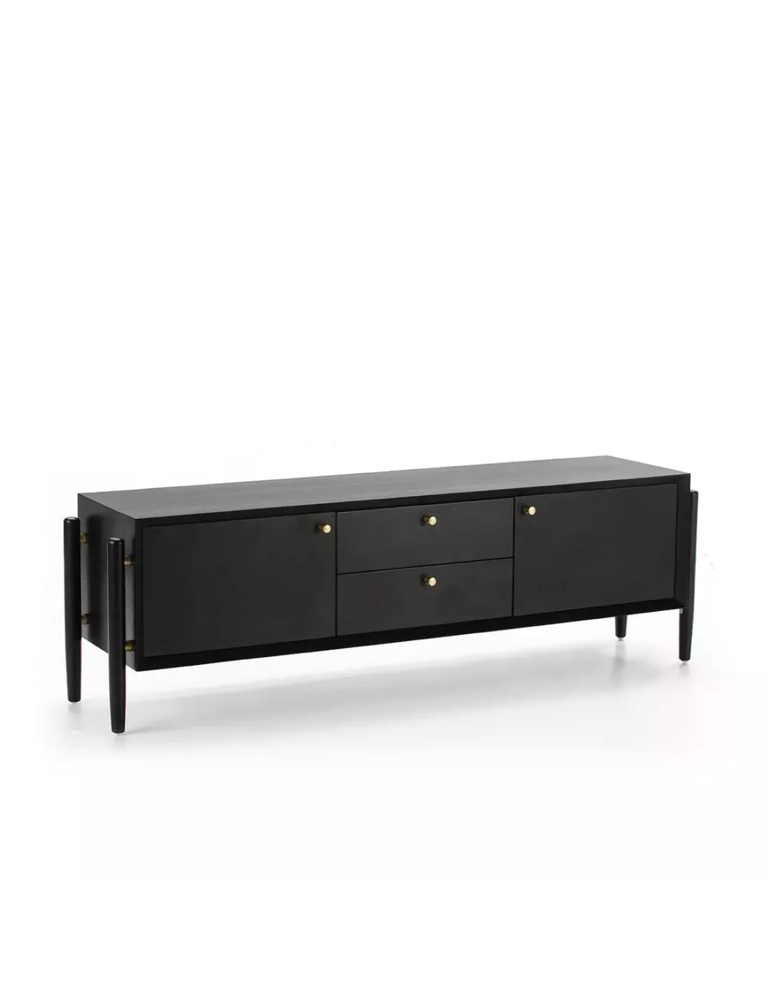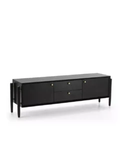 Laissez vous séduire par ce meuble TV Thai Natura en bois noir issus de forêts durables. Ce meuble TV, doté de 2 portes et de 2 tiroirs, se mariera avec tous les styles d’intérieur et donnera une touche raffinée à votre décoration. Ce meuble TV aux poignées en métal doré est fabriqué en Espagne.