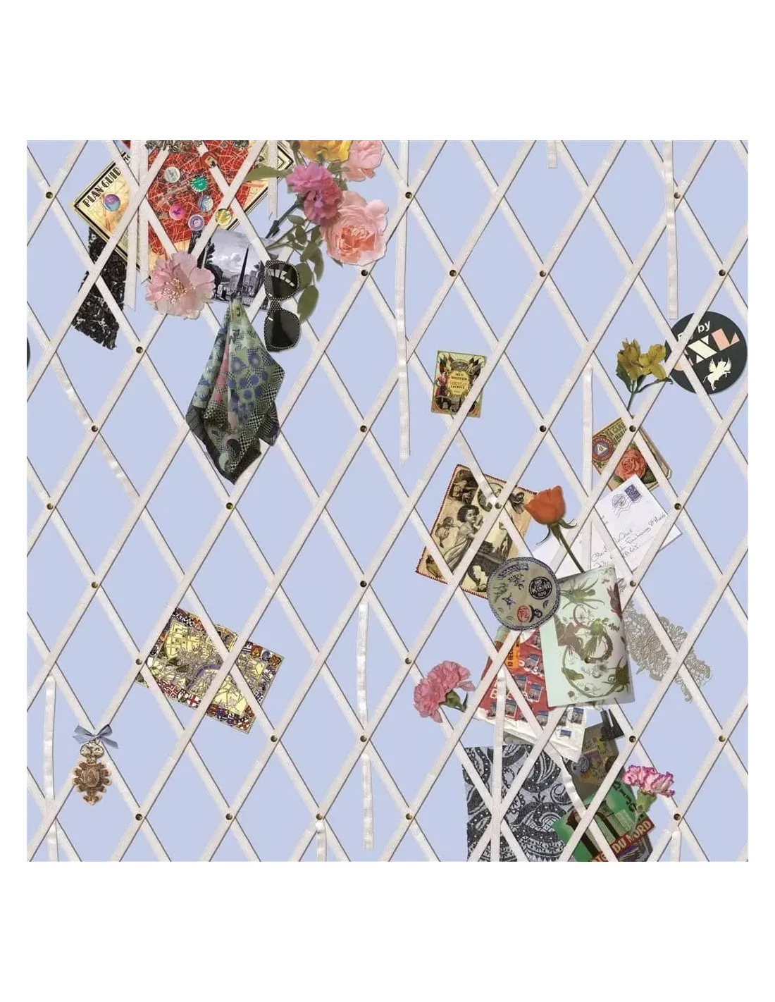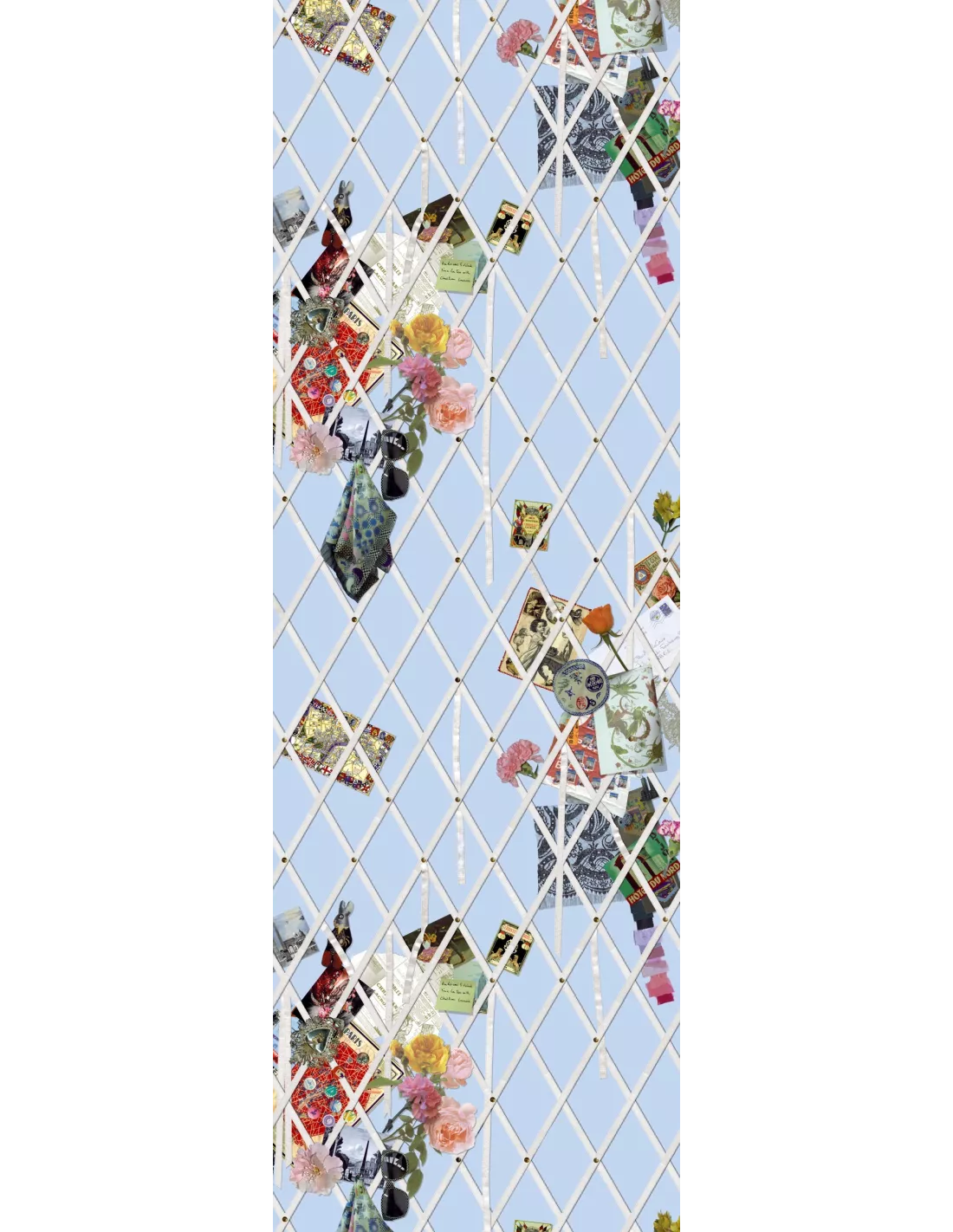 Le panneau décoratif en papier peint Souvenir représente un fin treillage en trompe l’oeil, dans lequel vient se glisser une pléiade de souvenirs inspirant les créations Lacroix. L’impression numérique est réalisée sur un luxueux support intissé, ce qui rend la pose du panneau plus facile. La colle doit être appliquée sur le mur.