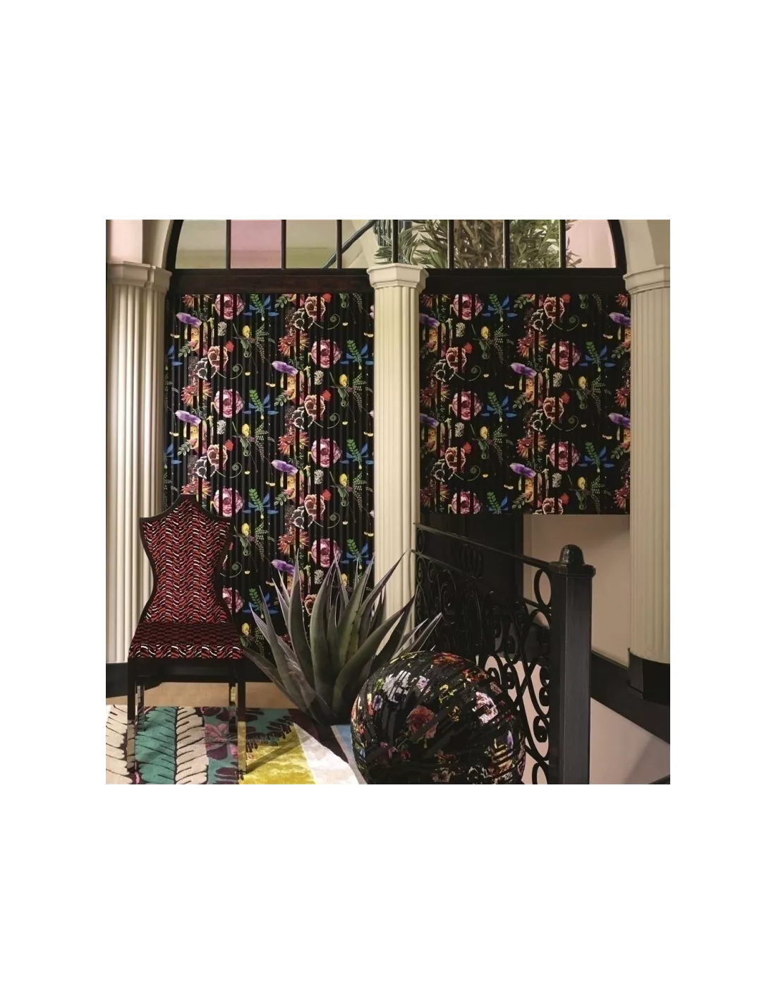 Ce somptueux motif de fleurs aux couleurs vibrantes, et imprimé numériquement, atteint une intensité inédite grâce à la superposition de larges rayures noires floquées. Amusez-vous à chercher son message d’amour secret ! Ce papier-peint est réalisé sur un support intissé luxueux, pour en faciliter la pose.