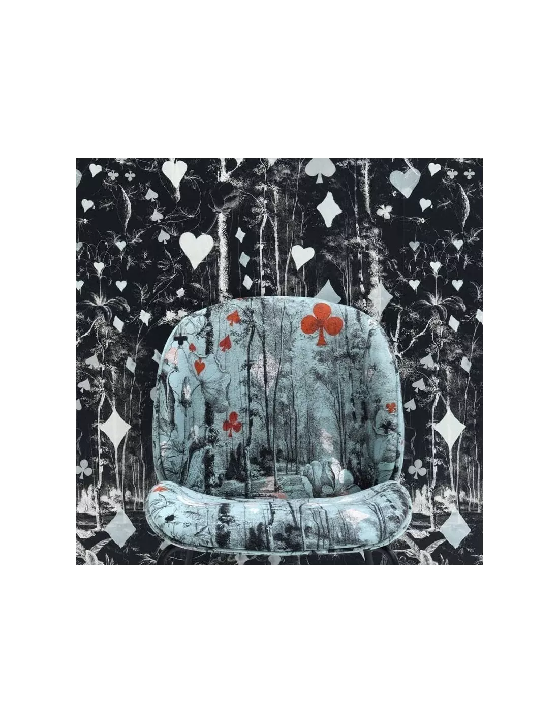 Avec Beriba Noir, Jean Paul Gaultier présente un paysage fantastique. À la manière d’une gravure, ce papier peint dessine des animaux dans une forêt enchantée. Les différents symboles des cartes à jouer recouvrent l’ensemble et apportent des touches de couleurs. Ce papier peint possède un support intissé, ce qui rend sa pose plus facile. La colle doit être appliquée sur le mur. Ce papier peint Jean Paul Gaultier est édité par la maison Lelièvre.