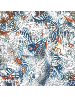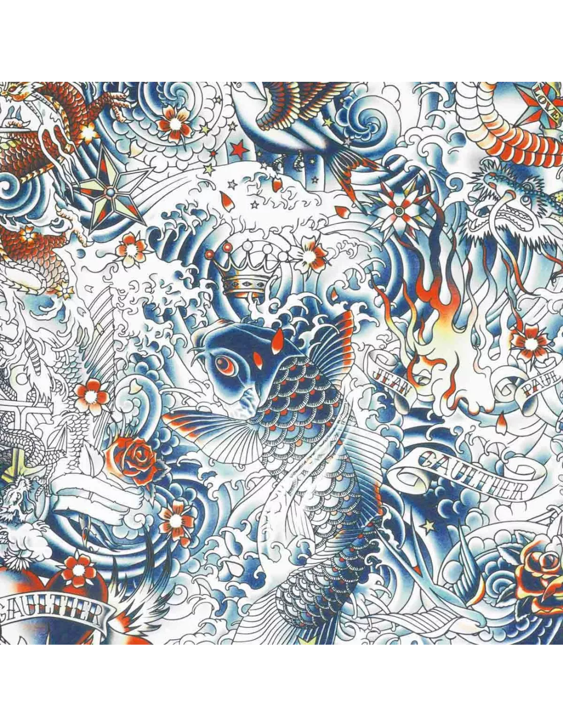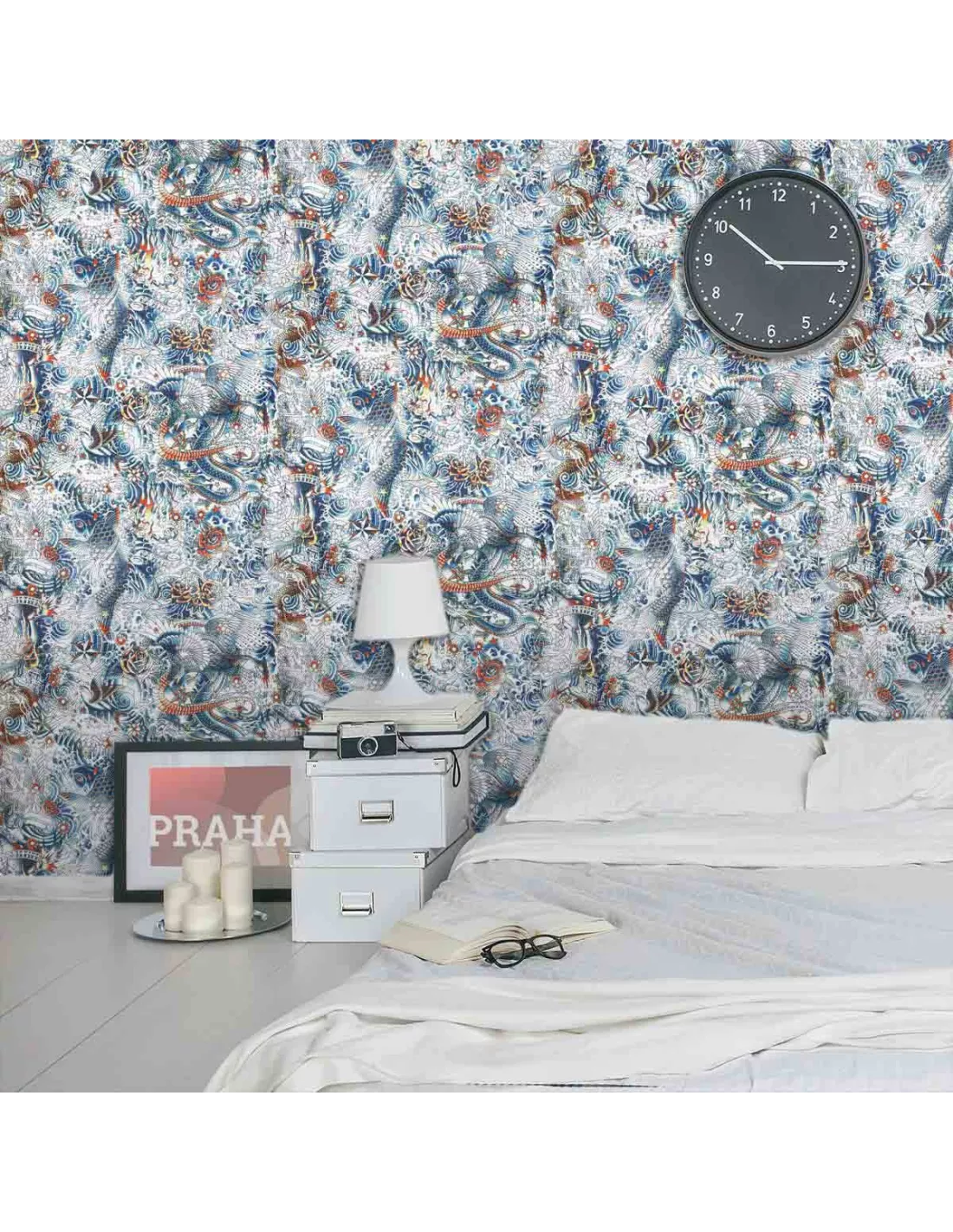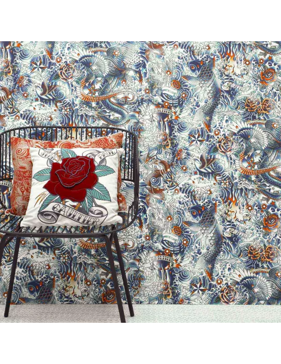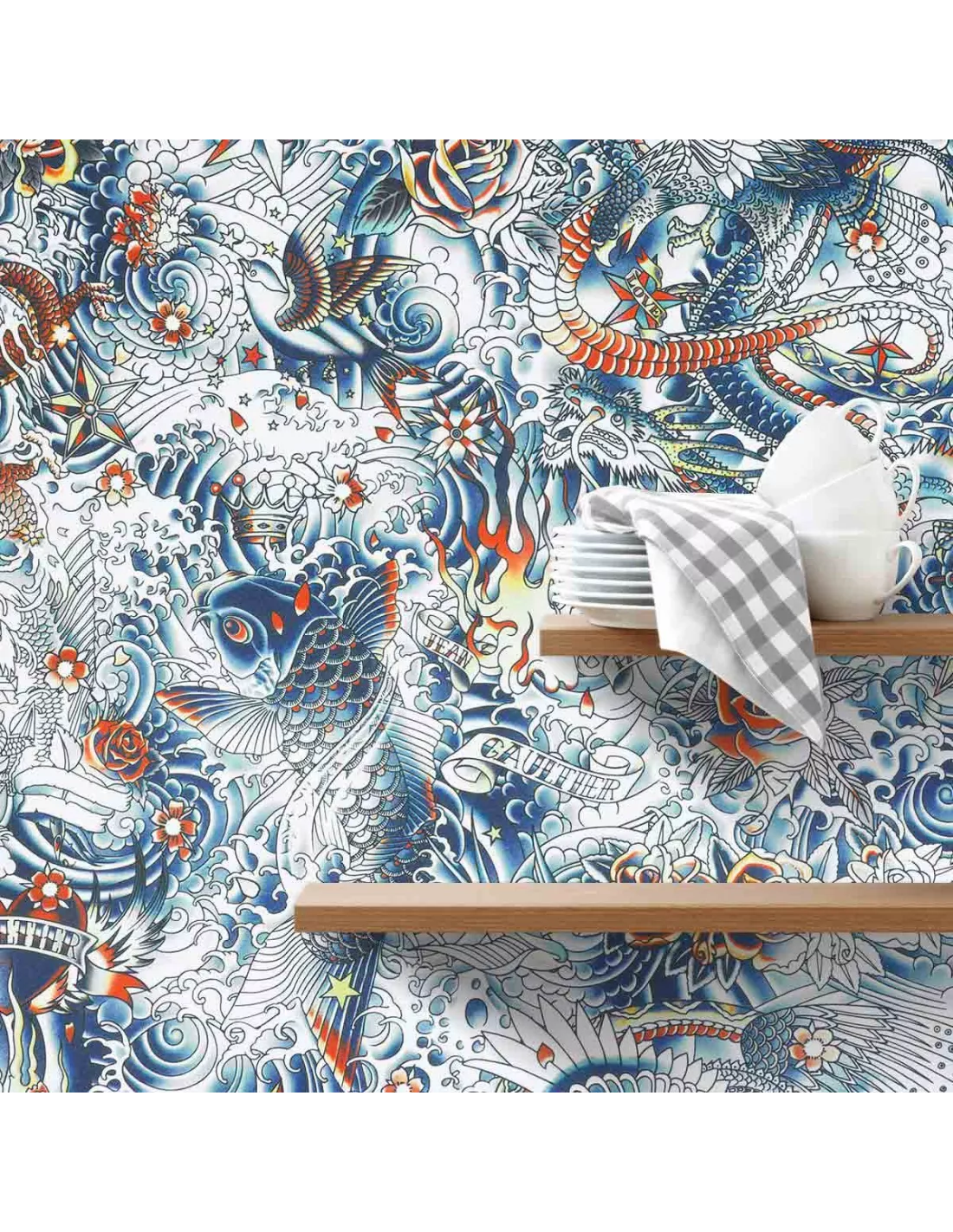 Le papier peint Irésumi Jean Paul Gaultier arbore un motif iconique de Jean Paul Gaultier : Dragons, poissons, vagues et roses composent ce dessin à dominante indigo inspiré des tatouages traditionnels japonais. Ce papier peint possède un support intissé, ce qui rend sa pose plus facile. La colle doit être appliquée sur le mur. Ce papier peint Jean Paul Gaultier est édité par la maison Lelièvre.