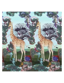 Conçu par Christian Lacroix, le papier peint panoramique Novafrica Sunrise 1 présente une Afrique imaginaire, spatiale et baroque. Des plantations exubérantes entourent des girafes, devant un fond ouvert et lumineux évoquant un soleil levant. La réalisation combine teintes naturelles et artificiellement saturées, formant un tableau visuellement saisissant.