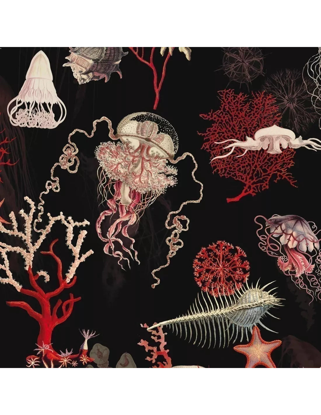 Le papier peint Corail Marine Jean Paul Gaultier est un papier peint vinyle au thème aquatique qui arbore une large variété de plantes et de créatures habitant les fonds océaniques. Hippocampes et méduses s’y côtoient au milieu d’une végétation sous-marine. Le motif est complété en arrière-plan par des silhouettes d’animaux marins. Ce papier peint possède un support intissé, ce qui rend sa pose plus facile. La colle doit être appliquée sur le mur. Ce papier peint Jean Paul Gaultier est édité par la maison Lelièvre.