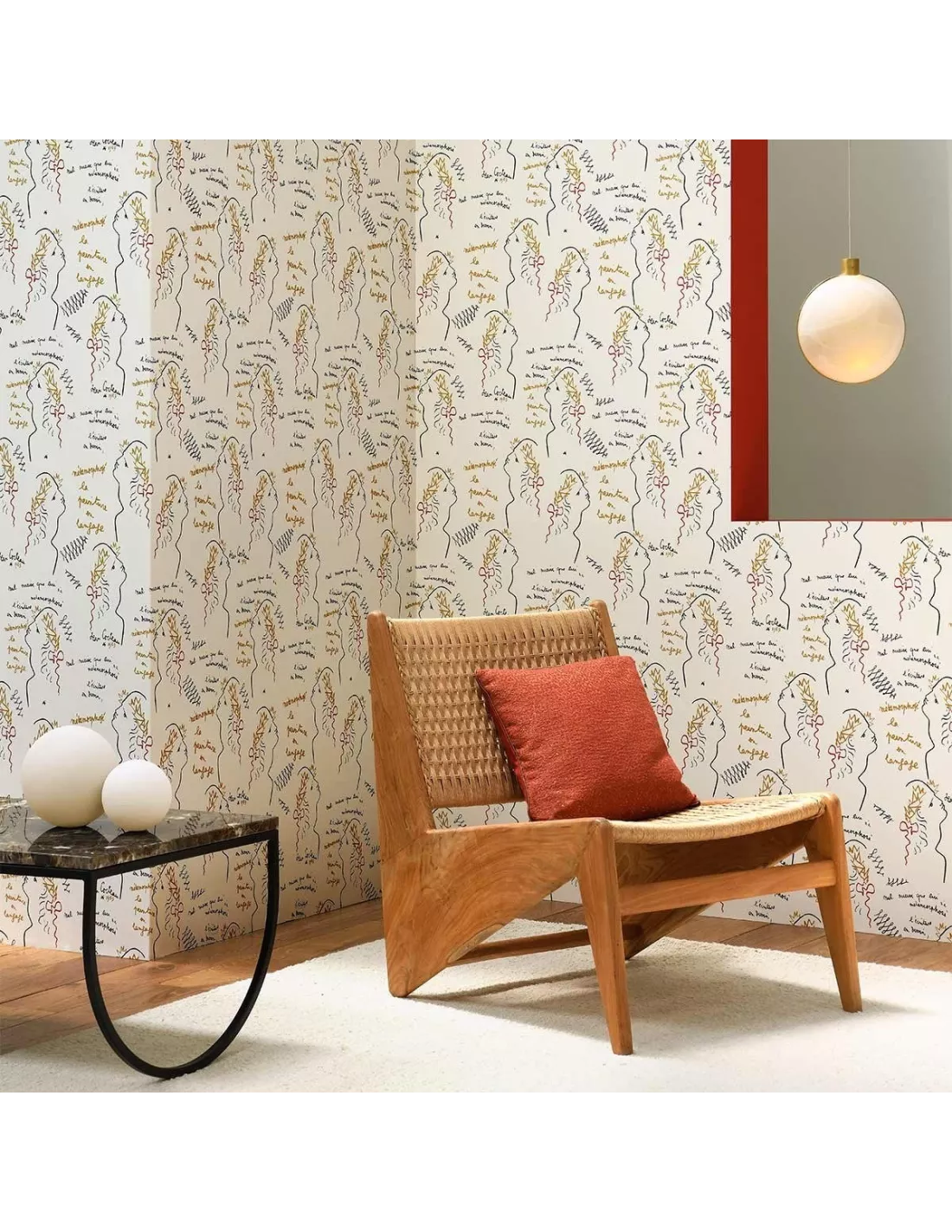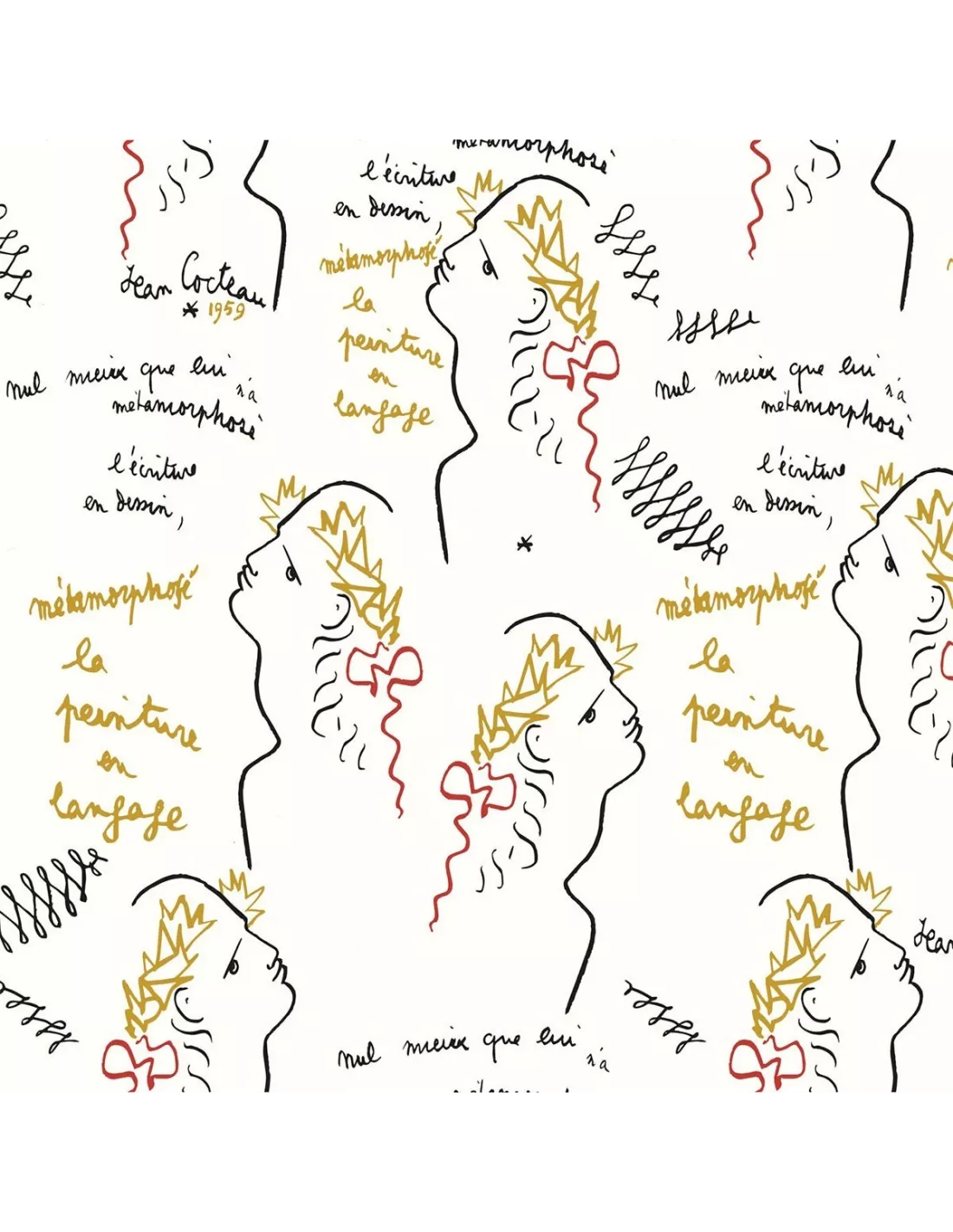 Papier peint vinyle multicolore inspiré d’inscriptions et de dessins de visages tirés de « Écriture » œuvre la plus célèbre de Jean Cocteau, Lelièvre