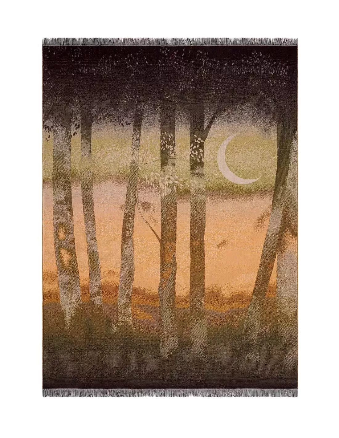 Le plaid Shinlin de K3 Design offre une expérience visuelle envoûtante, avec son paysage forestier captivant. Les troncs élancés des arbres se fondent dans un feuillage opulent, baignés dans la lueur dorée d’un soleil couchant. Tissé en jacquard à partir d’une laine mélangée, ce plaid allie confort et style raffiné. Ses franges sur les côtés apportent une finition élégante.