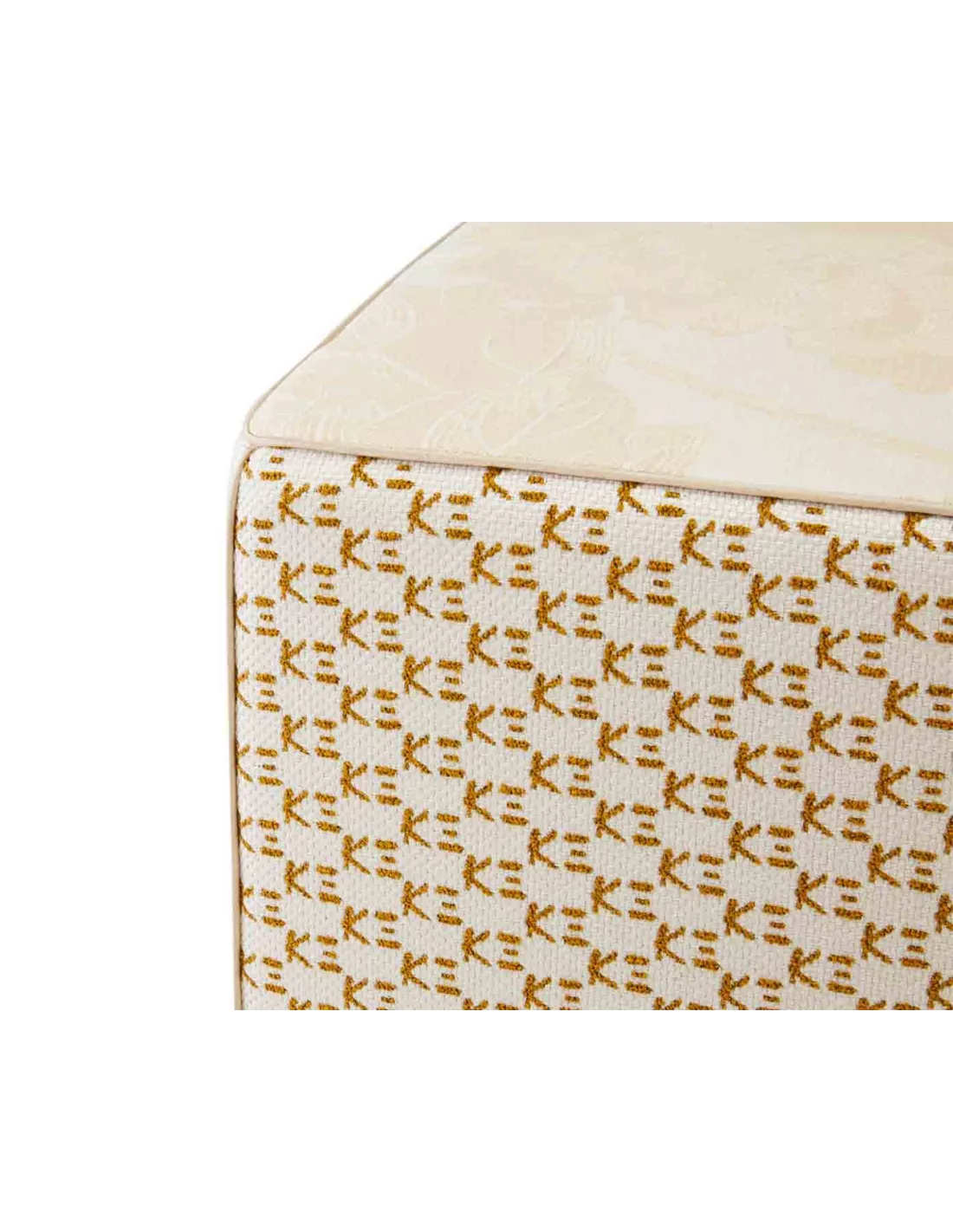 Le pouf Pivoine ivoire présente un mélange de romantisme et de modernité. Ce pouf Kenzo est réalisé avec un tissu jacquard en coton au motif de grandes pivoines, les parties latérales utilisent le tissu floral Kikyo et le tissu aux monogrammes en relief KO. Toutes les faces sont séparées par un passepoil en satin doré.