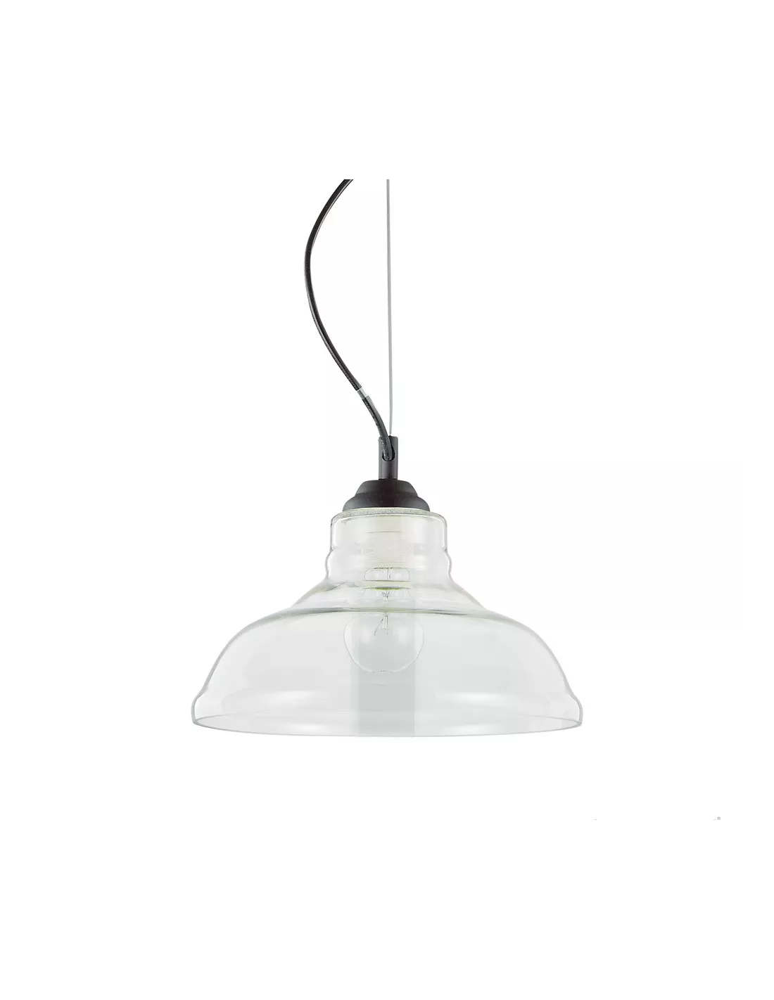 Cette suspension design Ideal Lux s’intègrera dans toutes les pièces de la maison. La suspension design Bistro est en métal verni noir (accroche plafond également). Son diffuseur est en verre soufflé transparent modélé artisanalement. Son câble est en tissu noir.