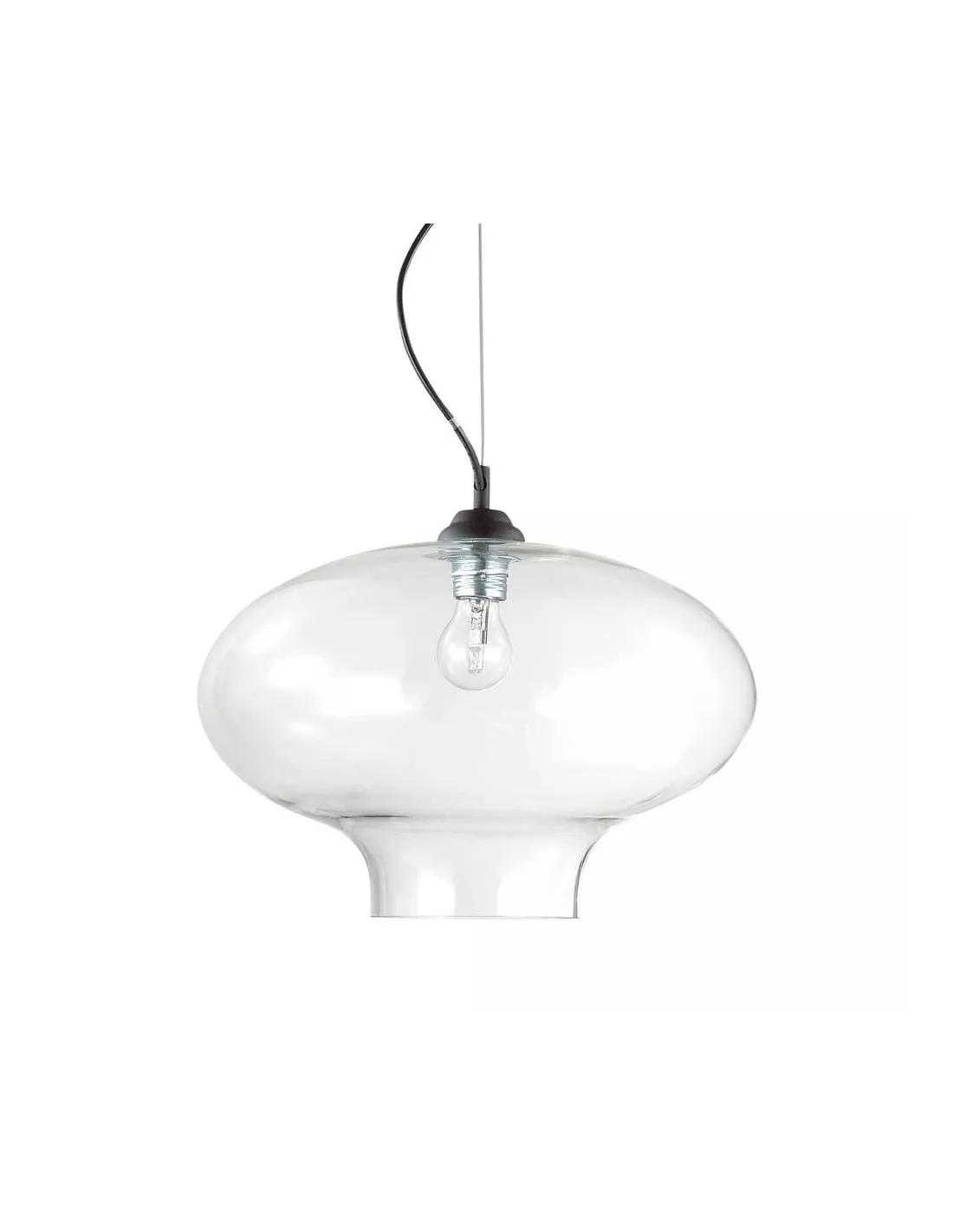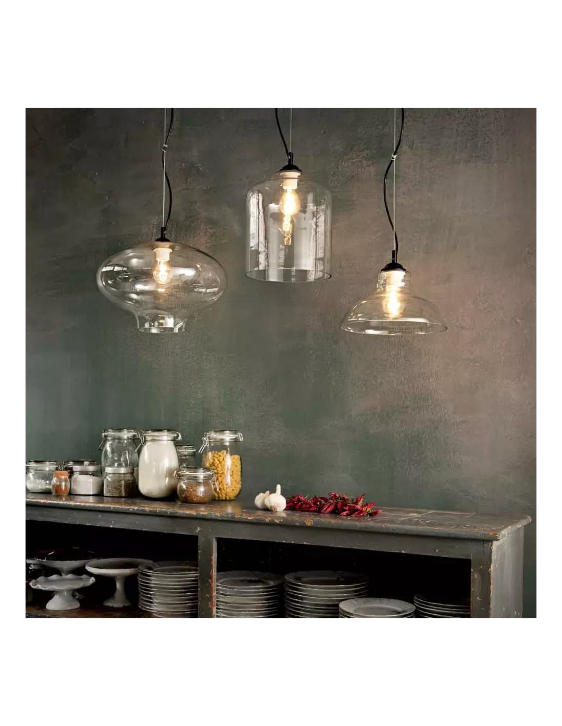 La suspension design Bistrot Ideal Lux s’intègrera dans toutes les pièces de la maison. Cette suspension design Ideal Lux est en métal verni noir (accroche plafond également). Son diffuseur est en verre soufflé transparent modélé artisanalement. Son câble est en tissu noir.