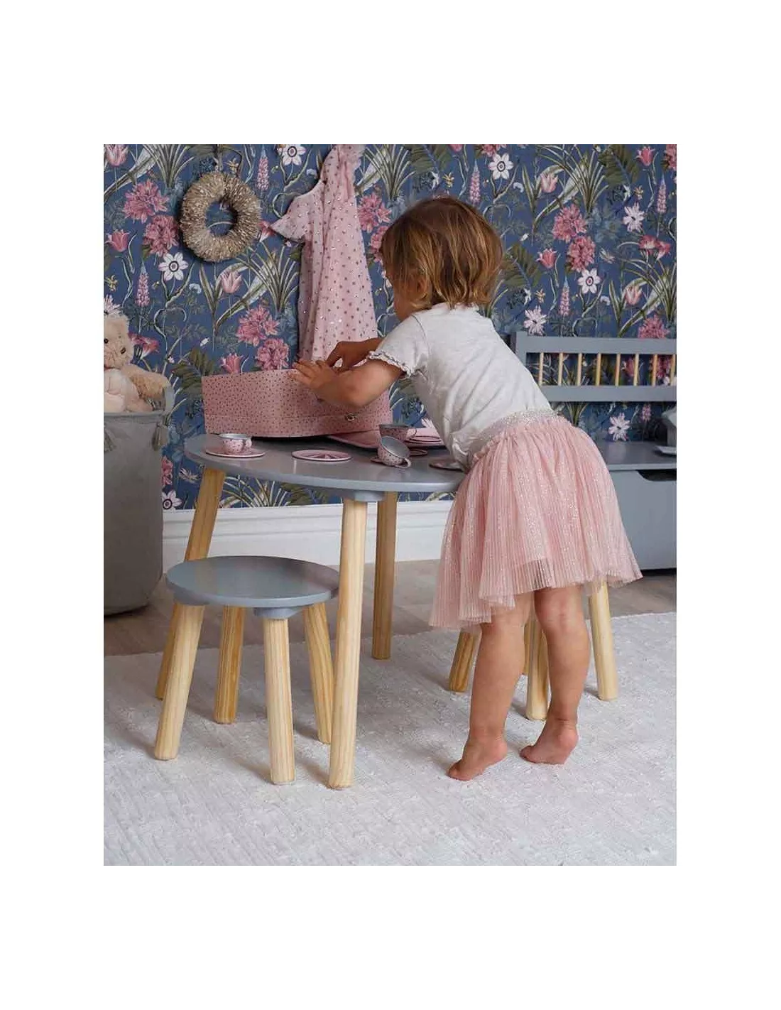 Table ronde grise pour enfants avec des pieds en bois et deux tabourets assortis. La table constitue un espace parfait pour jouer, dessiner et s’amuser. Elle est facile à déplacer à la maison. La surface est durable et facile à nettoyer avec un chiffon humide. La table et la surface d’assise des tabourets ont une surface laquée supplémentaire pour mieux résister aux rayures.