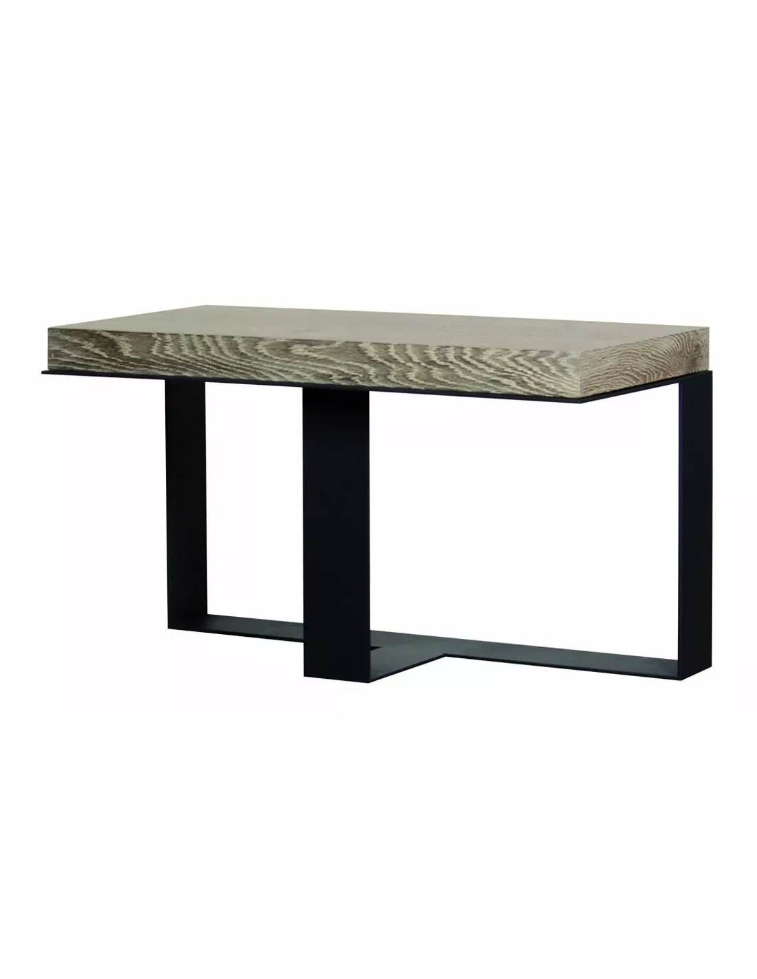 Table basse Buffalo dont le plateau est en lattes de vieux chêne massif. Le plateau de cette table basse est en lattes de vieux chêne massif, sablées, grisées et blanchies. Les piètements sont en acier brut vernis extra mat. Cette table basse est réalisée en atelier par des artisans, pièce par pièce.