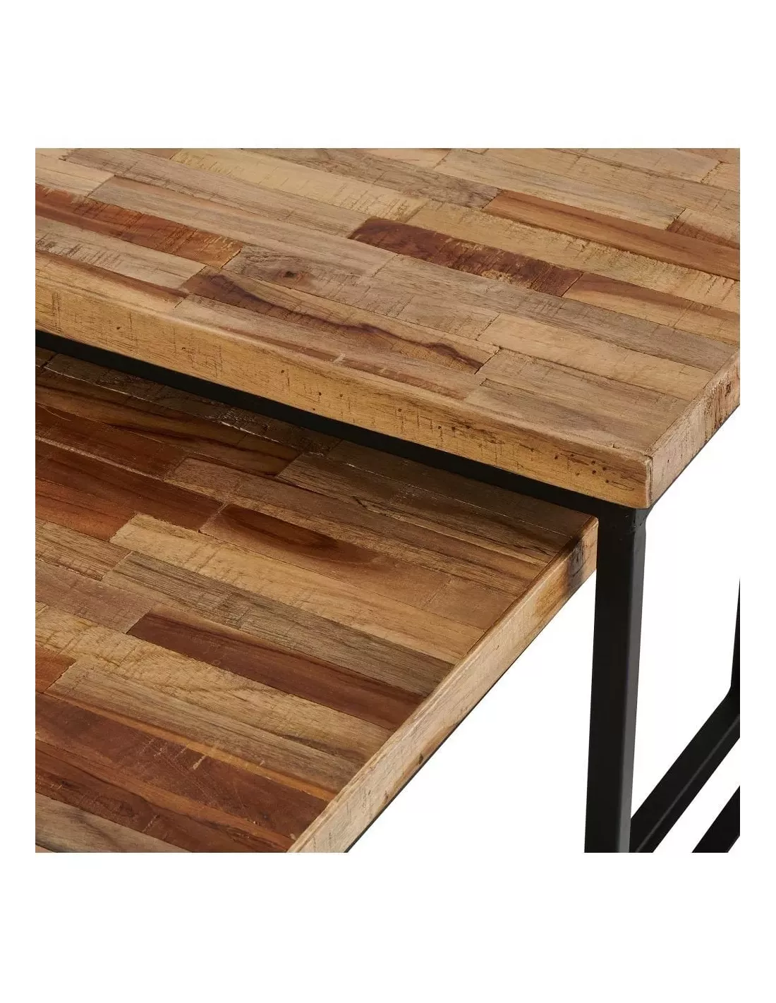 Observez le magnifique travail d’assemblage des lames de teck brut, révélant toute la beauté naturelle de ce bois. Les plateaux, quant à eux, arborent une finition laquée à base d’eau, les rendant faciles d’entretien avec un simple chiffon sec.