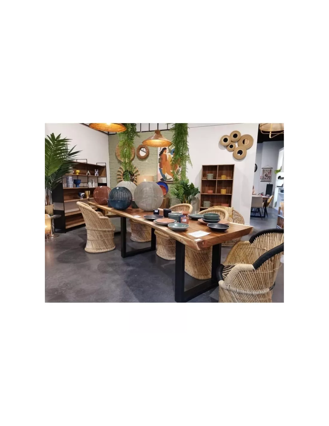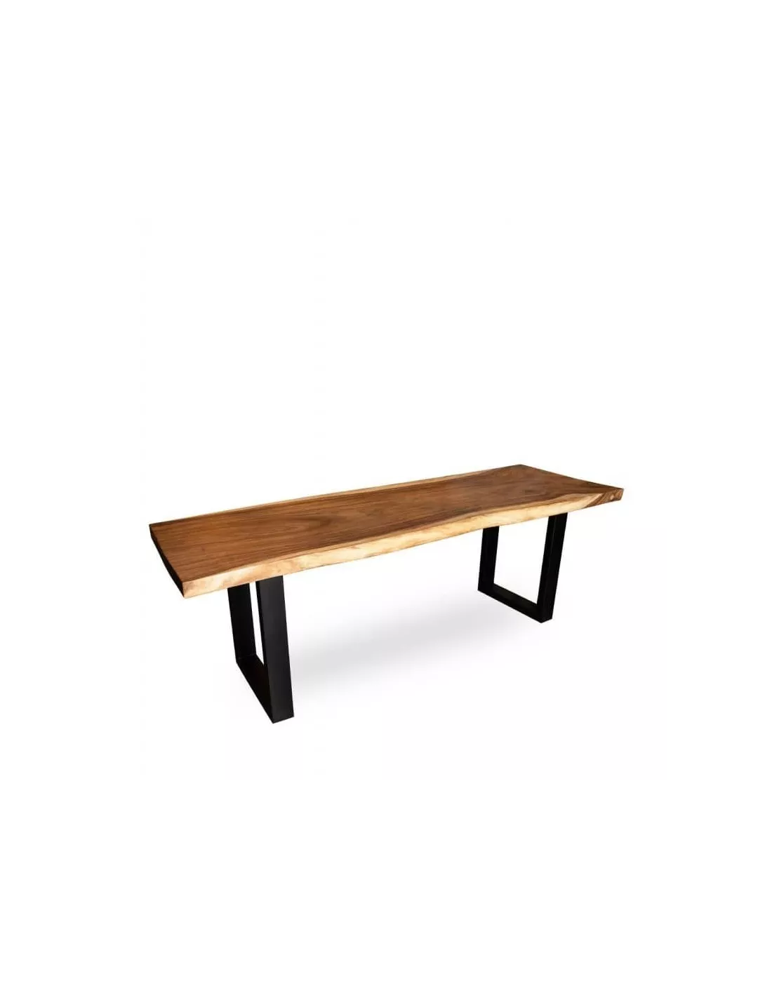 Cette très belle table de repas en bois de suar affiche un rendu incroyable ! Elle est dotée d’un plateau très résistant et noble, provenant d’Indonésie. Une finition live edge lui permet de conserver la forme originelle et naturelle du tronc de l’arbre. Son piètement en métal permet à cette table à manger de rester solide sur ses appuis lors de vos repas entre amis ou en famille. Cette table de repas est proposée en 4 dimensions, de 220 à 360 cm de long.