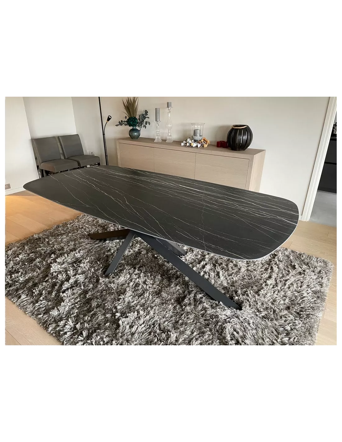 Cette table de salle à manger Céramique Versatil est un véritable accessoire de décoration d’intérieur et fera de cette table design, une table de repas élégante et raffinée. La forme « tonneau », c’est à dire rectangulaire avec les coins arrondis, ne permet pas d’ajouter de rallonge à cette table. Très tendance et naturelle, la céramique est 100% minérale et 100% recyclable. Ses performances sont exceptionnelles puisqu’elle est insensible aux tâches, ultra-résistante aux rayures et à la chaleur, et d’une hygiène irréprochable. La table en céramique est donc très pratique. Finition de la table proposée en page de garde : 75