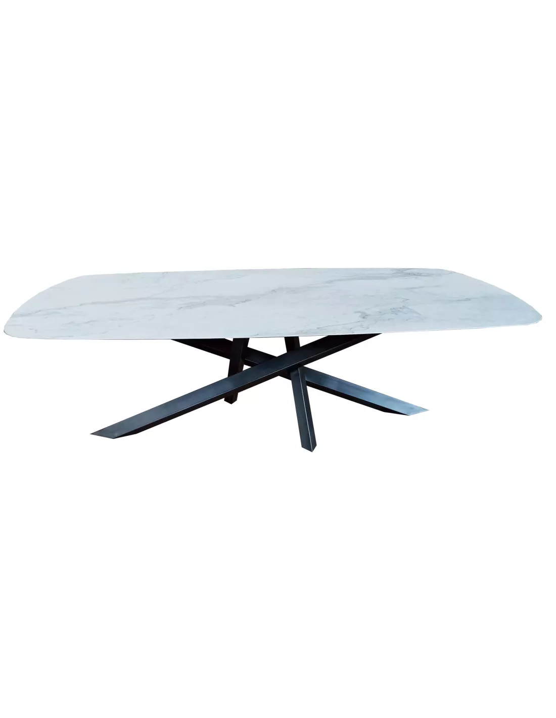 Table de salle à manger design rectangulaire avec coins arrondis en céramique façon marbre