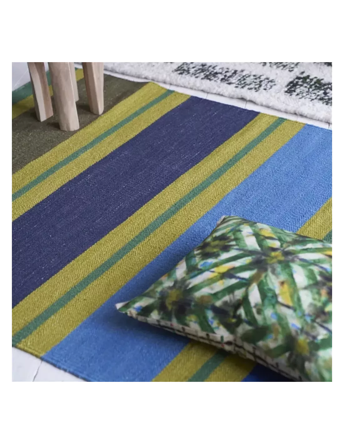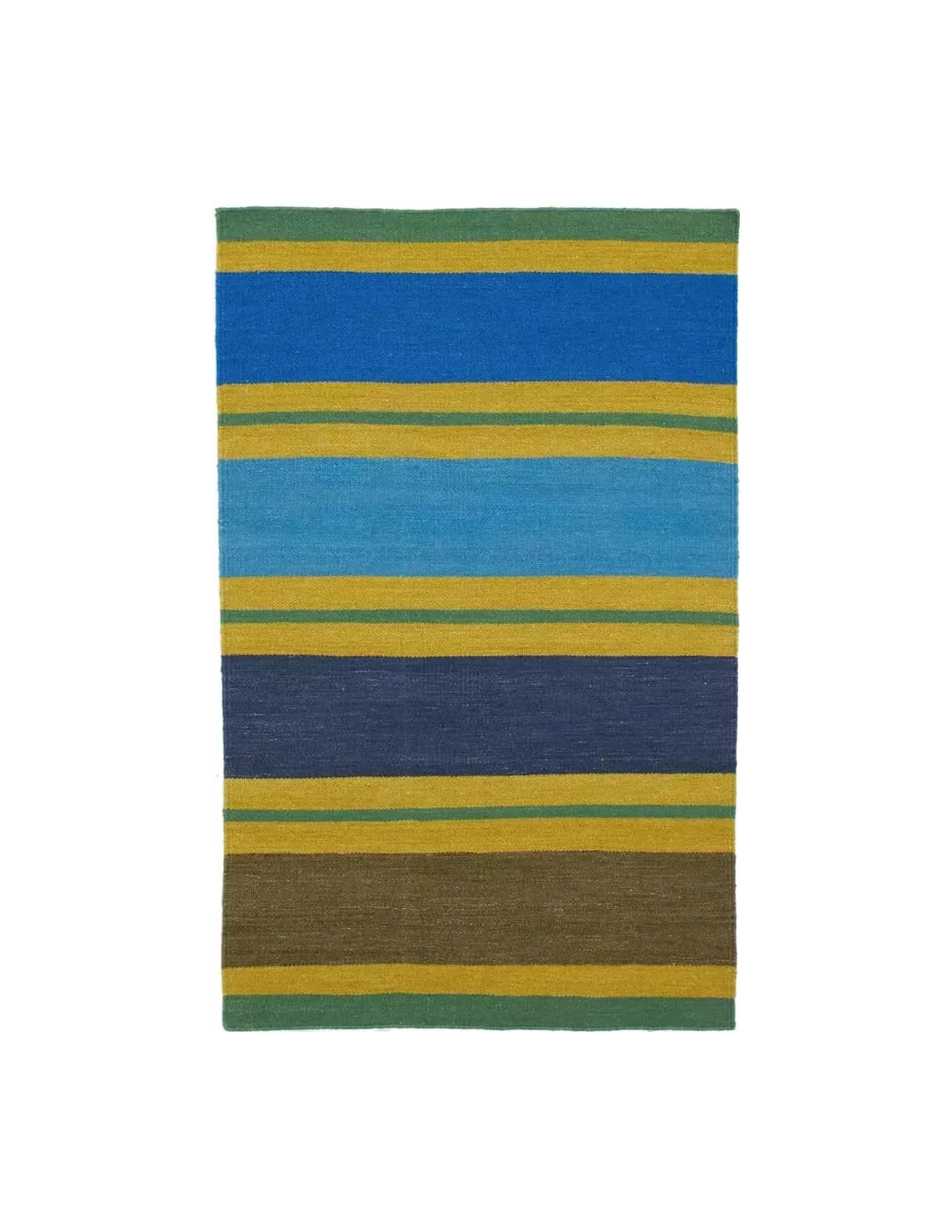 La pureté de la laine utilisée confère à ce tapis une texture moelleuse et durable, soulignée par la finesse du tissage Punja. Des bandes de couleur dans de sublimes tons bleus et verts se combinent harmonieusement.