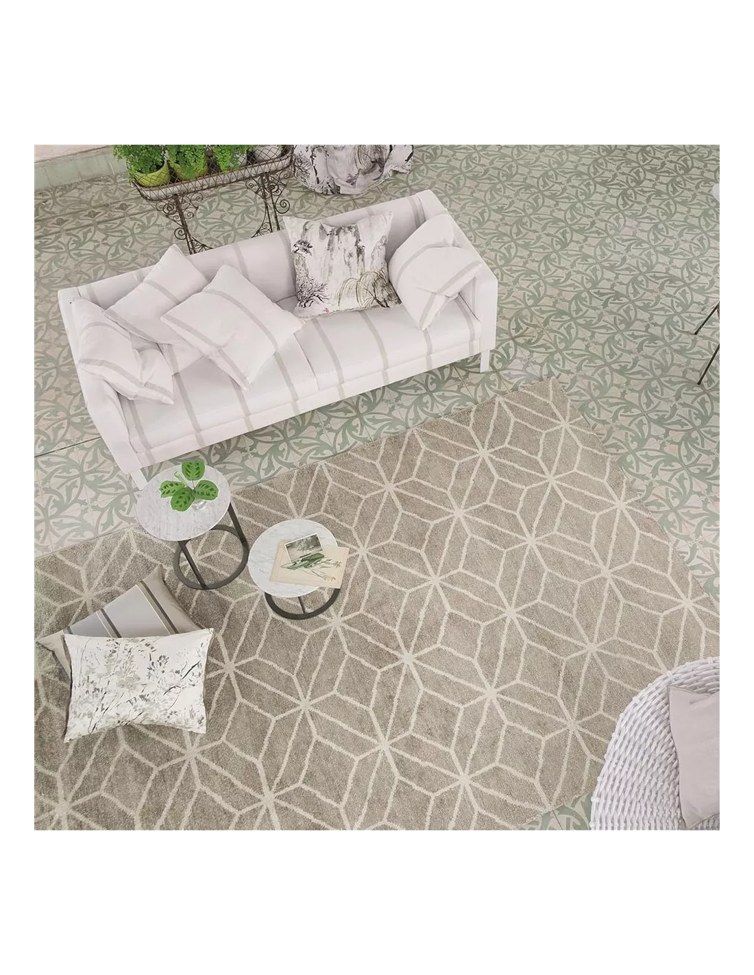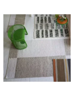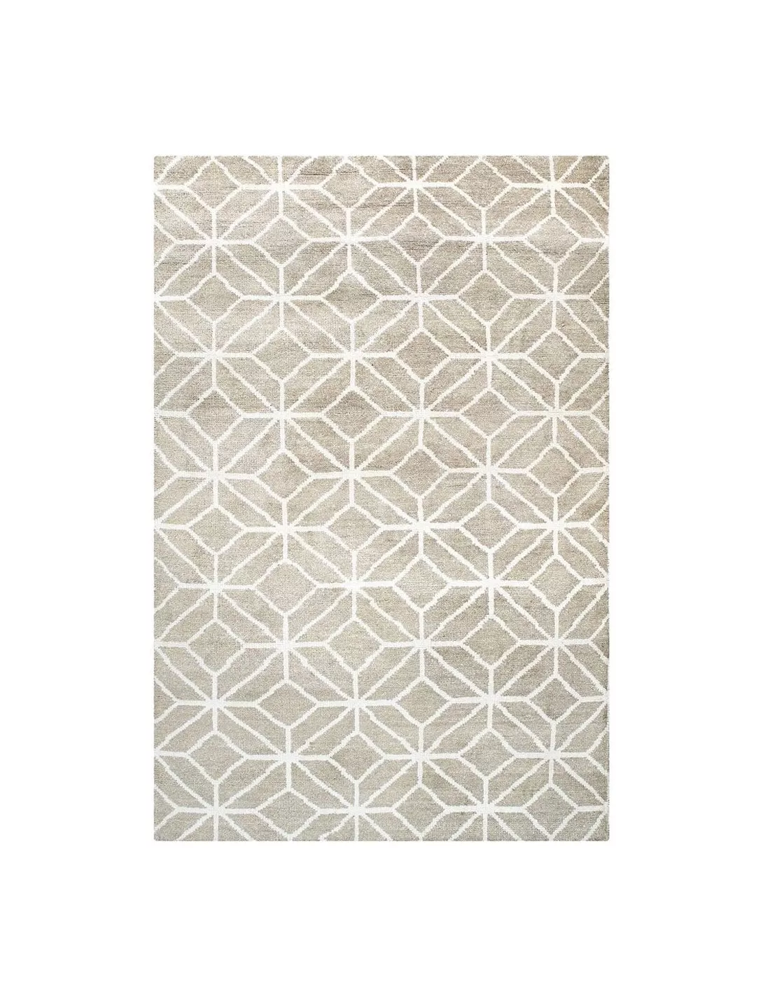 Tapis Caretti Linen Designers Guild : Un tapis design au style moderne et naturel présentant un éclat doux et naturel. Il est noué à la main et arbore un motif géométrique de treillis en blanc sur beige.