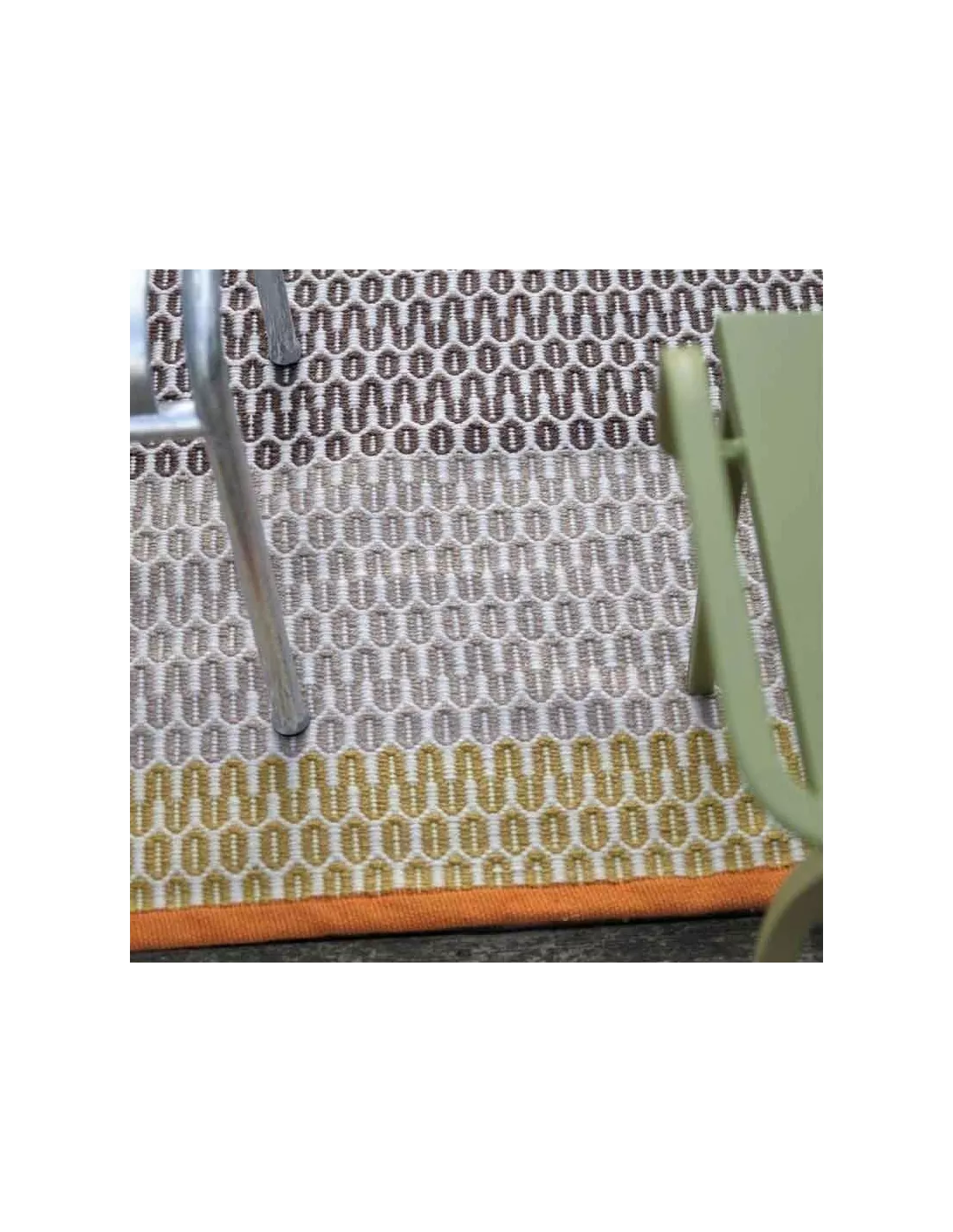 Réversible et résistant, le tapis Cortez Saffron Outdoor et réversible est confectionné à partir de 875 bouteilles en plastique recyclé. Ce modèle arbore un design graphique de petits hexagones qui forment des bandes de couleurs différentes. Adaptée aux usages extérieurs, cette création facile à nettoyer est également légère. Coussins, tissus et plaids coordonnés sur le site.