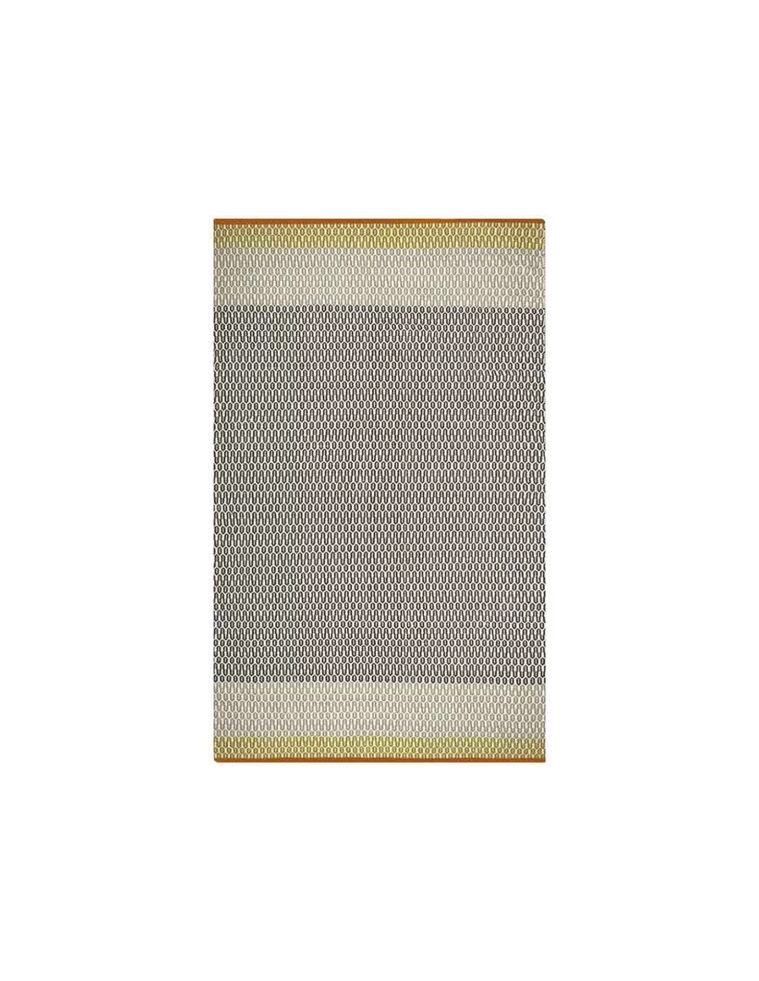 Tapis outdoor design au motif graphique de petits hexagones qui forment des bandes de couleurs différentes, Designers Guild