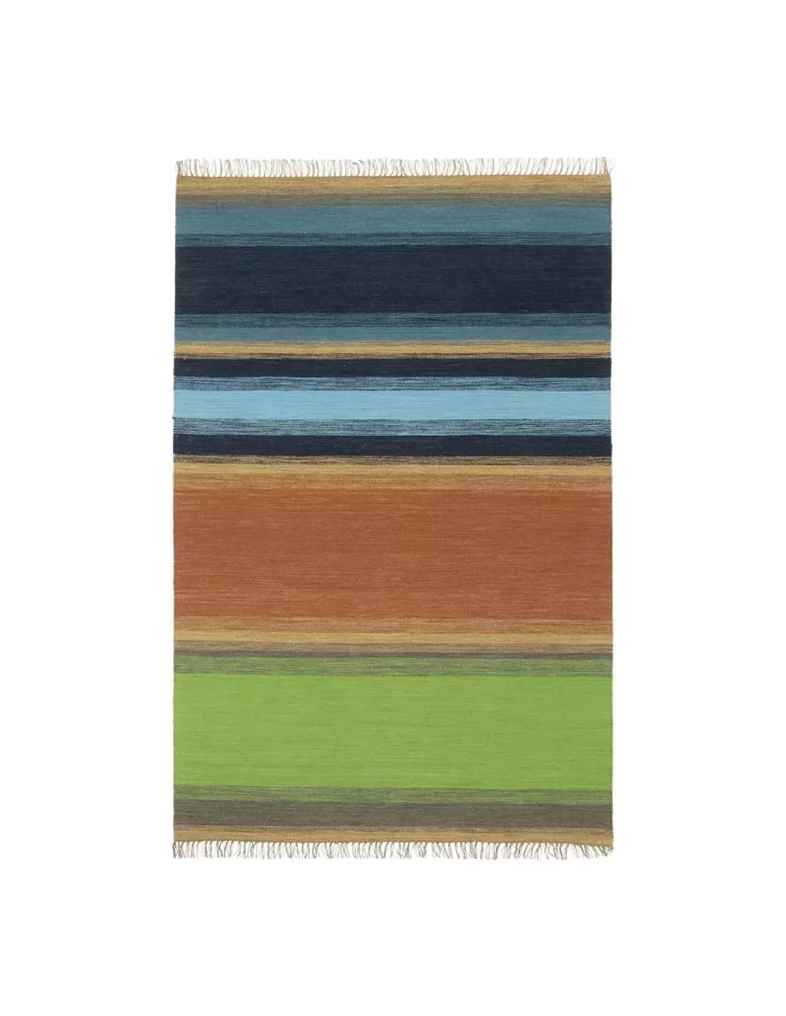 Chaque fibre de laine a été patiemment agencée pour former ces lignes horizontales qui se succèdent, créant un effet saisissant. Les nuances d’indigo, de bleu nuit et de blanc cassé s’entremêlent, se répondent et s’harmonisent avec subtilité. Des touches plus vives de turquoise et de rouge viennent ponctuer ce rythme régulier, apportant une dynamique addictive.