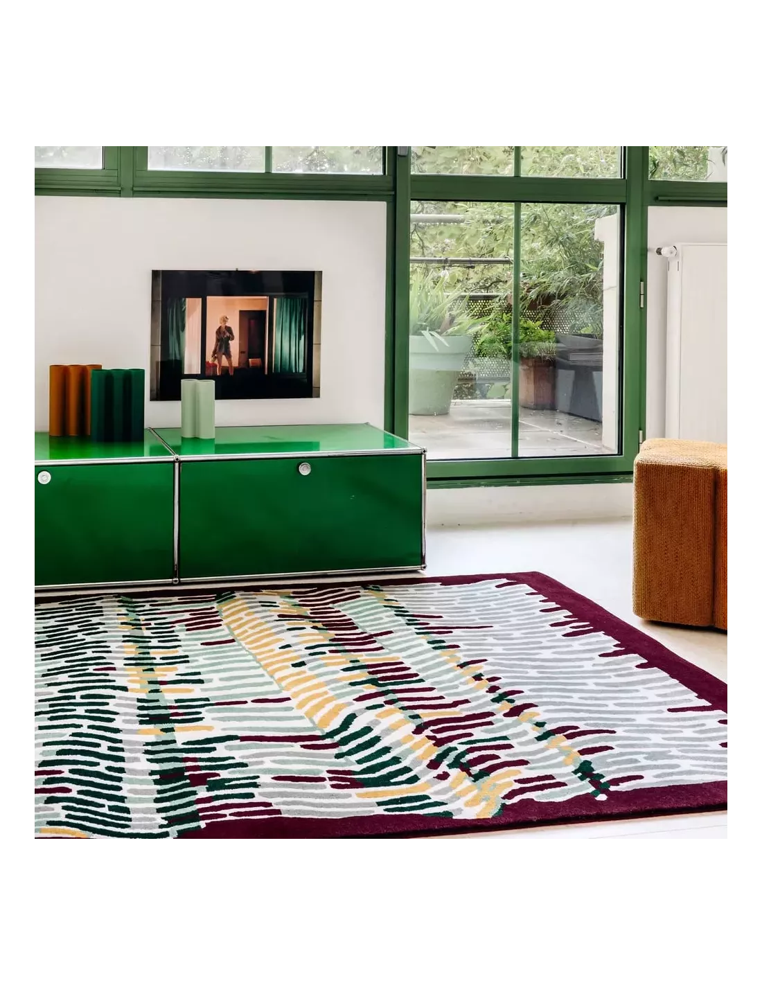 Le tapis multicolore Ether est le fruit d’un travail artisanal remarquable. Son dessin, aux allures de coups de pinceau colorés, a été spécialement créé par le designer et scénographe français Piergil Fourquié. Ce designer a su donner vie à une composition graphique unique et pleine de dynamisme, à travers des traits de pinceau irréguliers et spontanés.