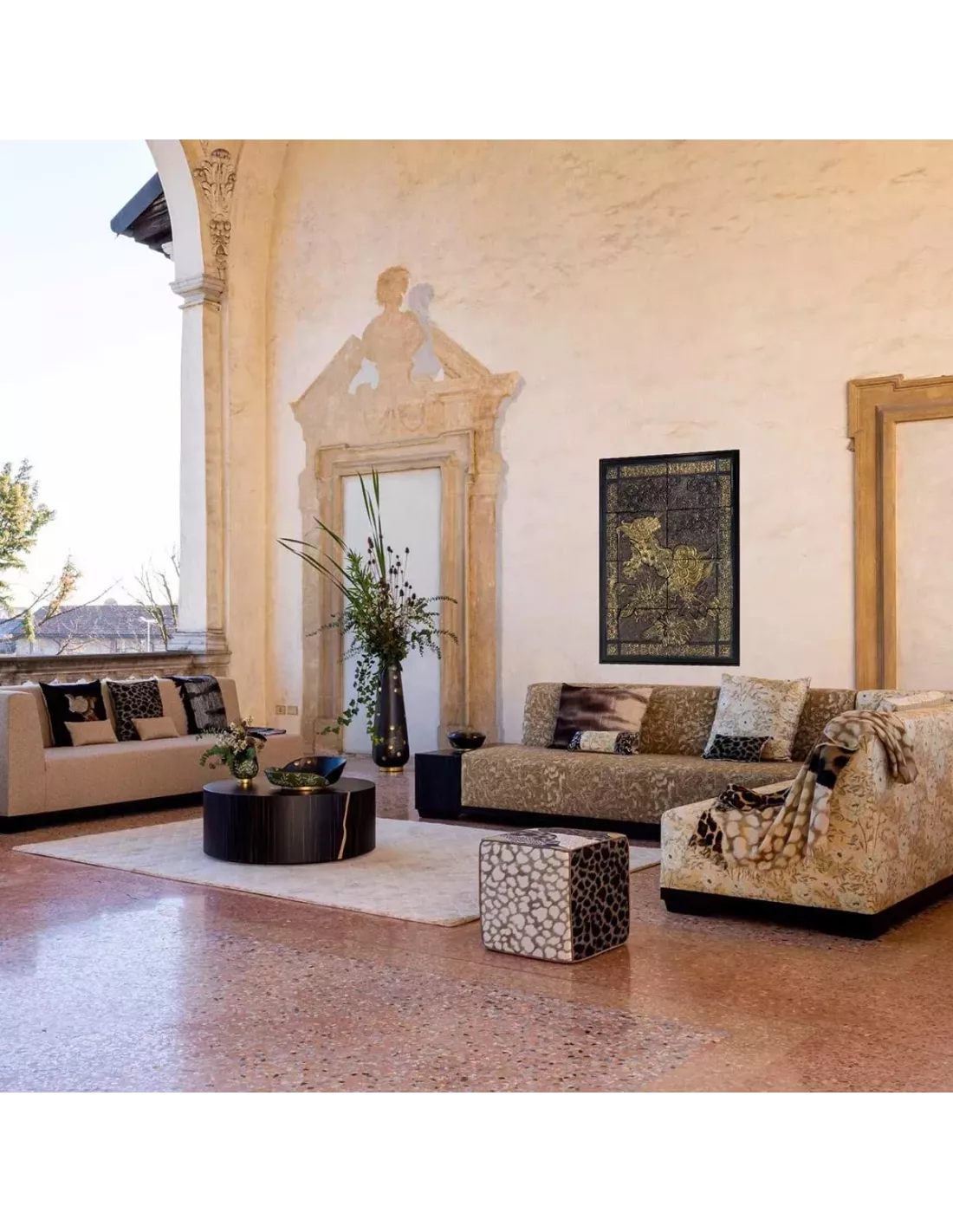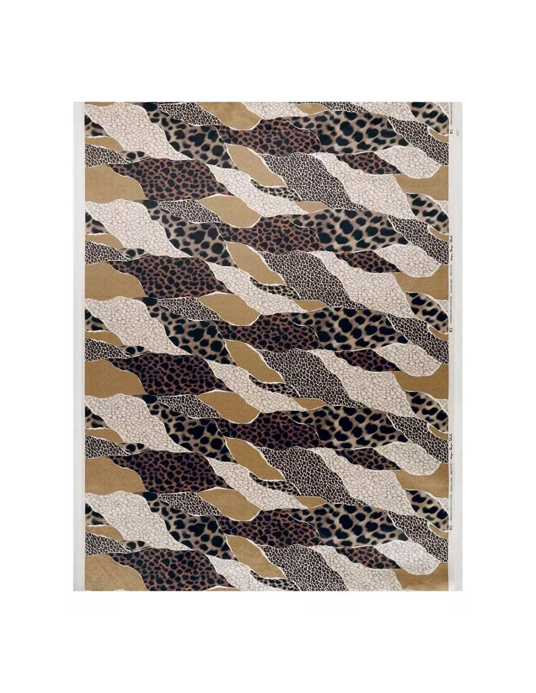 Le tissu Doubustu Gara est un symbole d’audace, dévoilant un motif animalier imaginé par Kenzo Takada. La maison K3 Design propose ici une composition en patchwork qui rassemble avec brio les motifs de diverses peaux de bêtes.