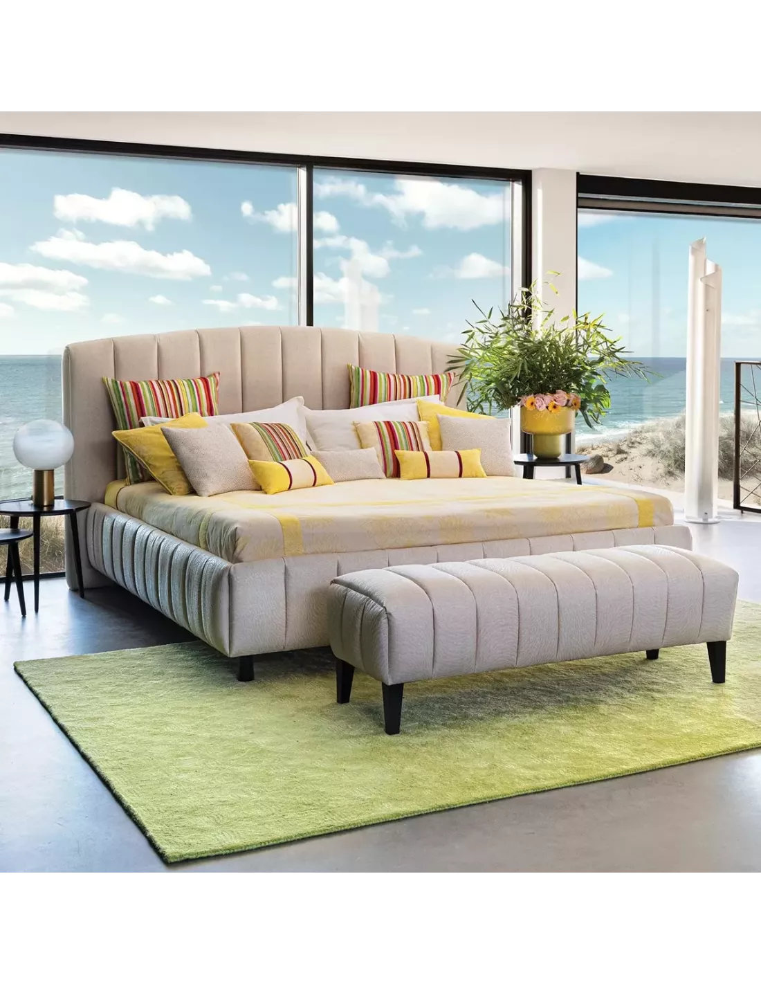 Shimia Velluto, créé par Kenzo Takada pour K3 Design, s’épanouit dans un feu d’artifice de couleurs vives, magnifiant l’éclat de l’été. Ode à la splendeur du style classique, ce tissu jacquard se pare d’une myriade de rayures aux dimensions variées. Sa texture veloutée invite irrésistiblement à la caresse.
